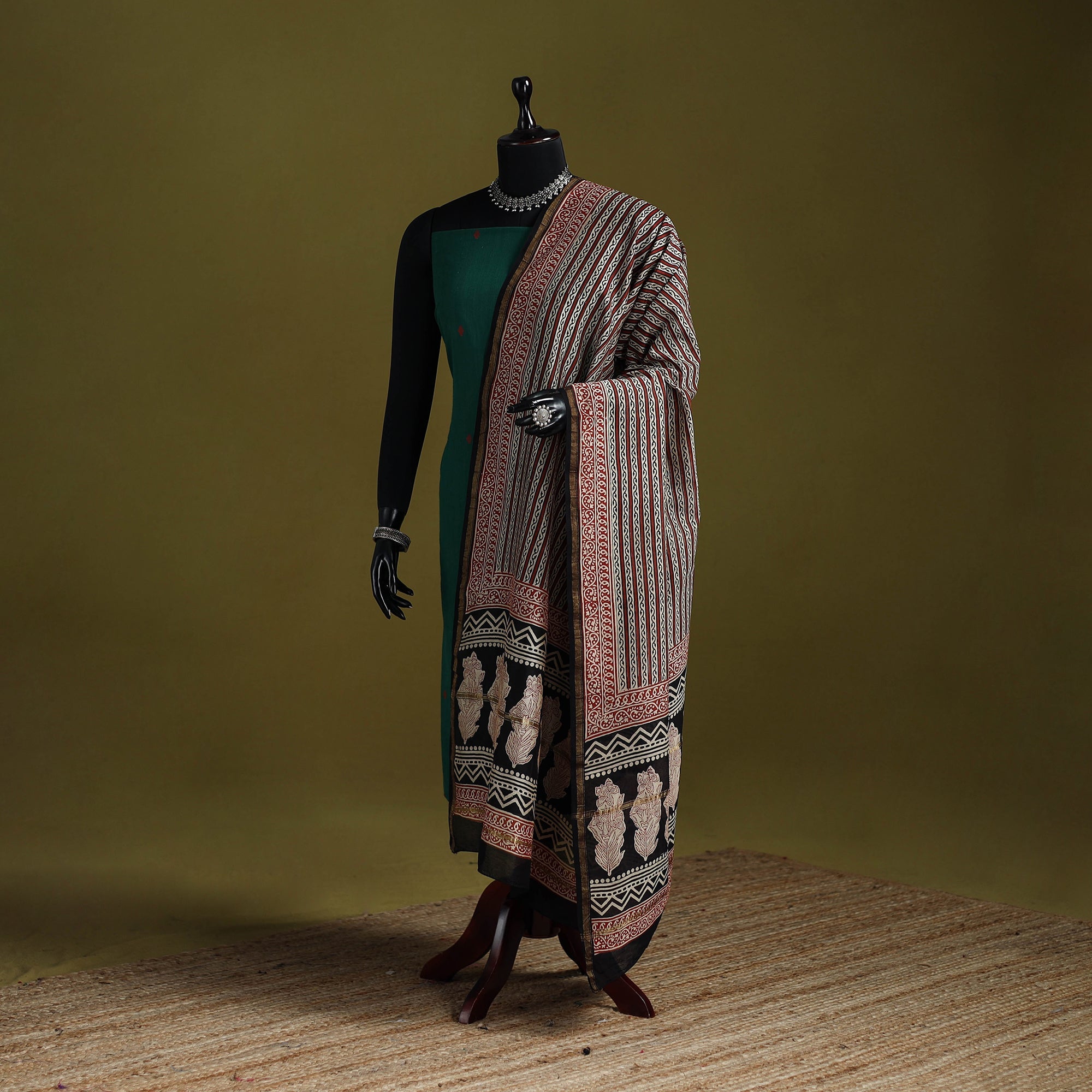 Experience the traditional artistry of Rajasthan with our brown bagru hand block printed chanderi silk-cotton dupatta with zari border. This exquisite dupatta is made using natural dyes through the traditional mud resist process using hand-carved wooden blocks practiced in Bagru, Rajasthan. This versatile dupatta complements any outfit, making it a perfect accessory for casual outings or special events, effortlessly combining traditional craftsmanship with contemporary elegance.