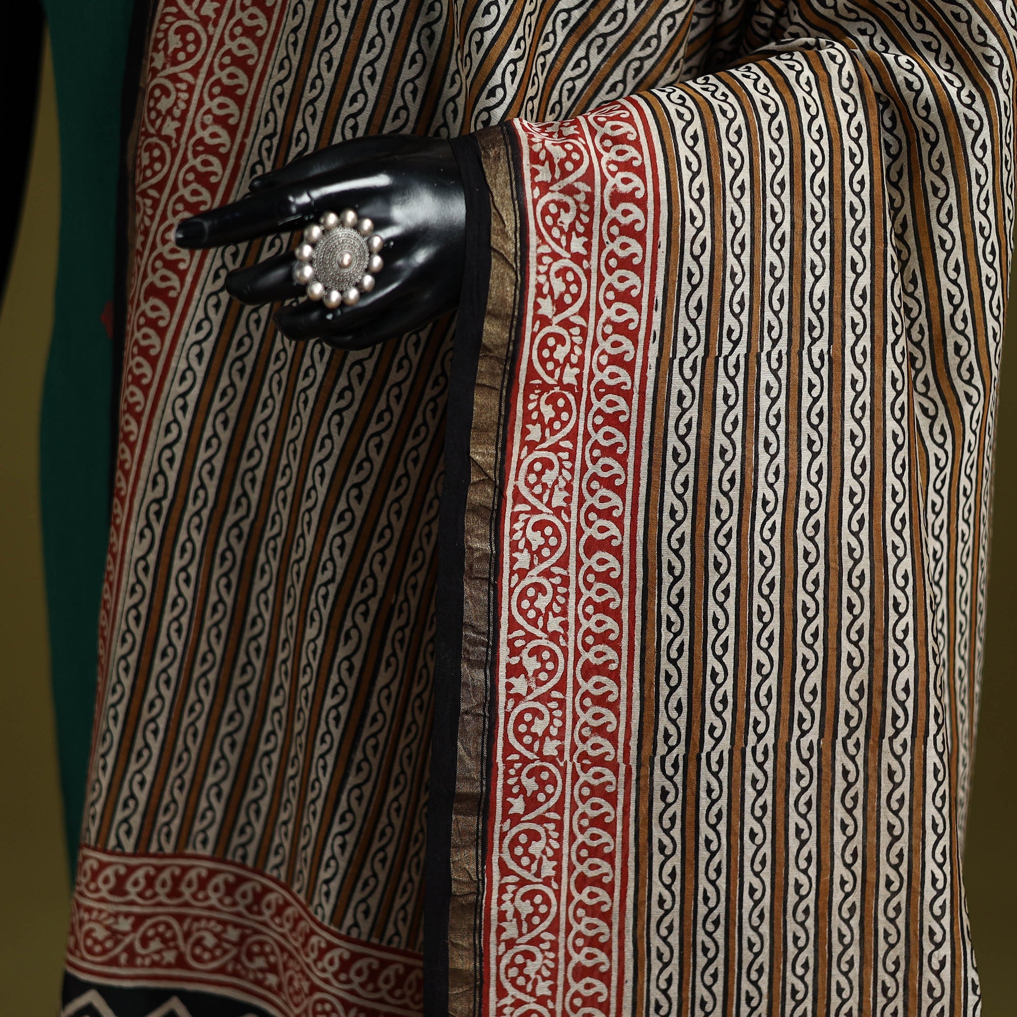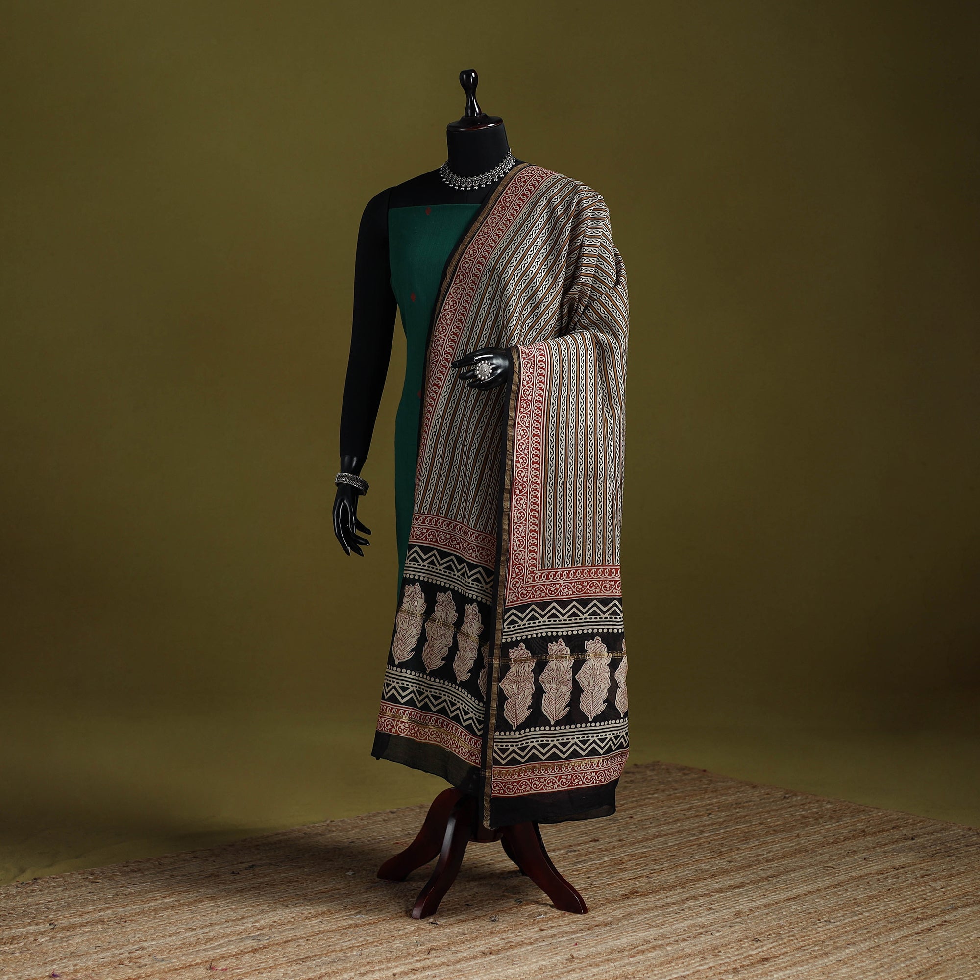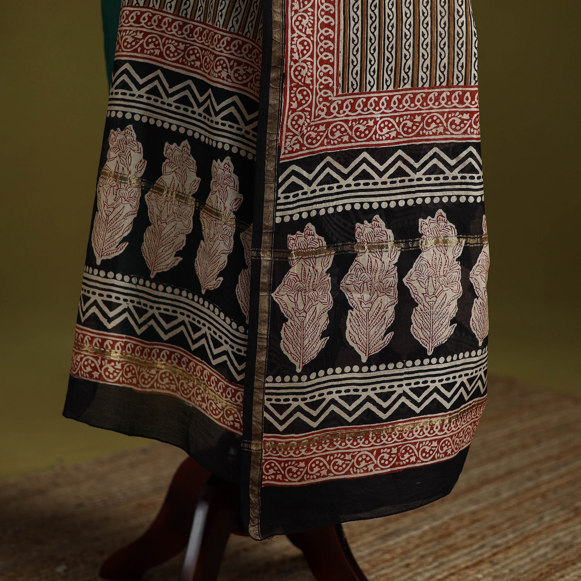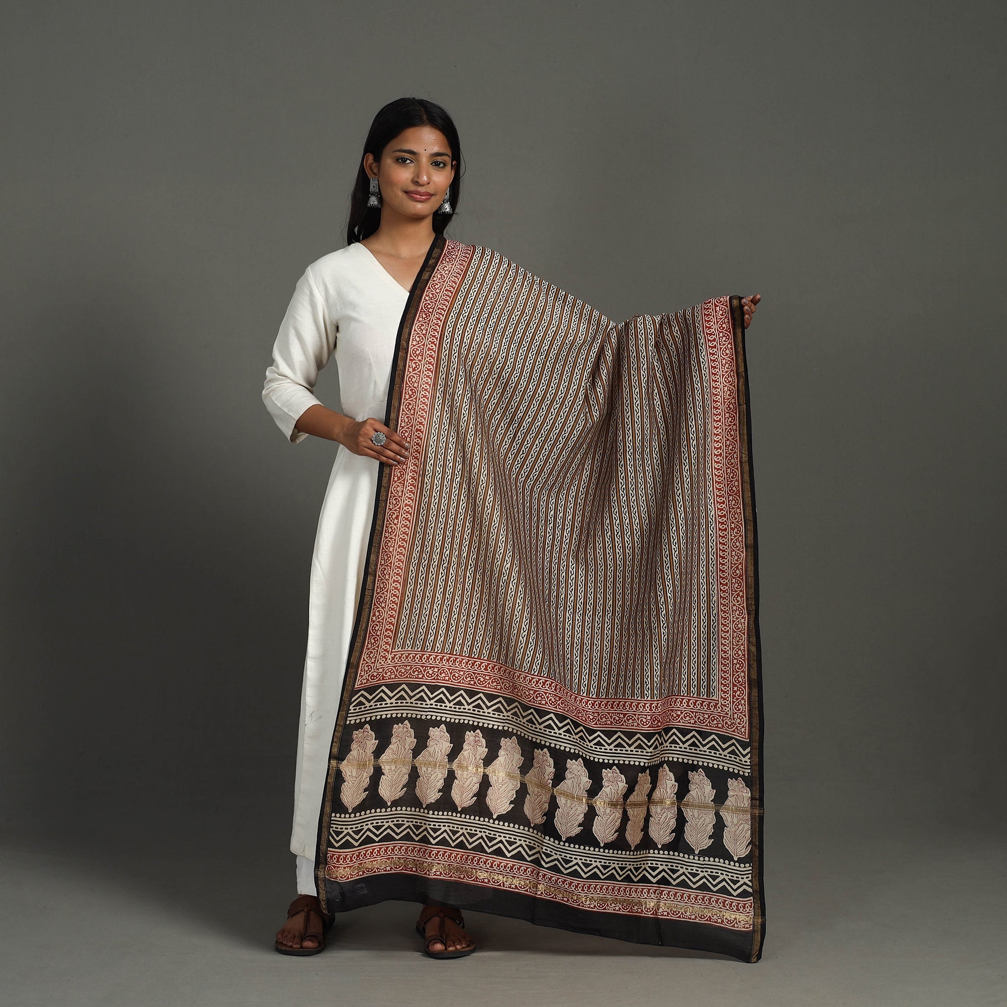 Experience the traditional artistry of Rajasthan with our brown bagru hand block printed chanderi silk-cotton dupatta with zari border. This exquisite dupatta is made using natural dyes through the traditional mud resist process using hand-carved wooden blocks practiced in Bagru, Rajasthan. This versatile dupatta complements any outfit, making it a perfect accessory for casual outings or special events, effortlessly combining traditional craftsmanship with contemporary elegance.