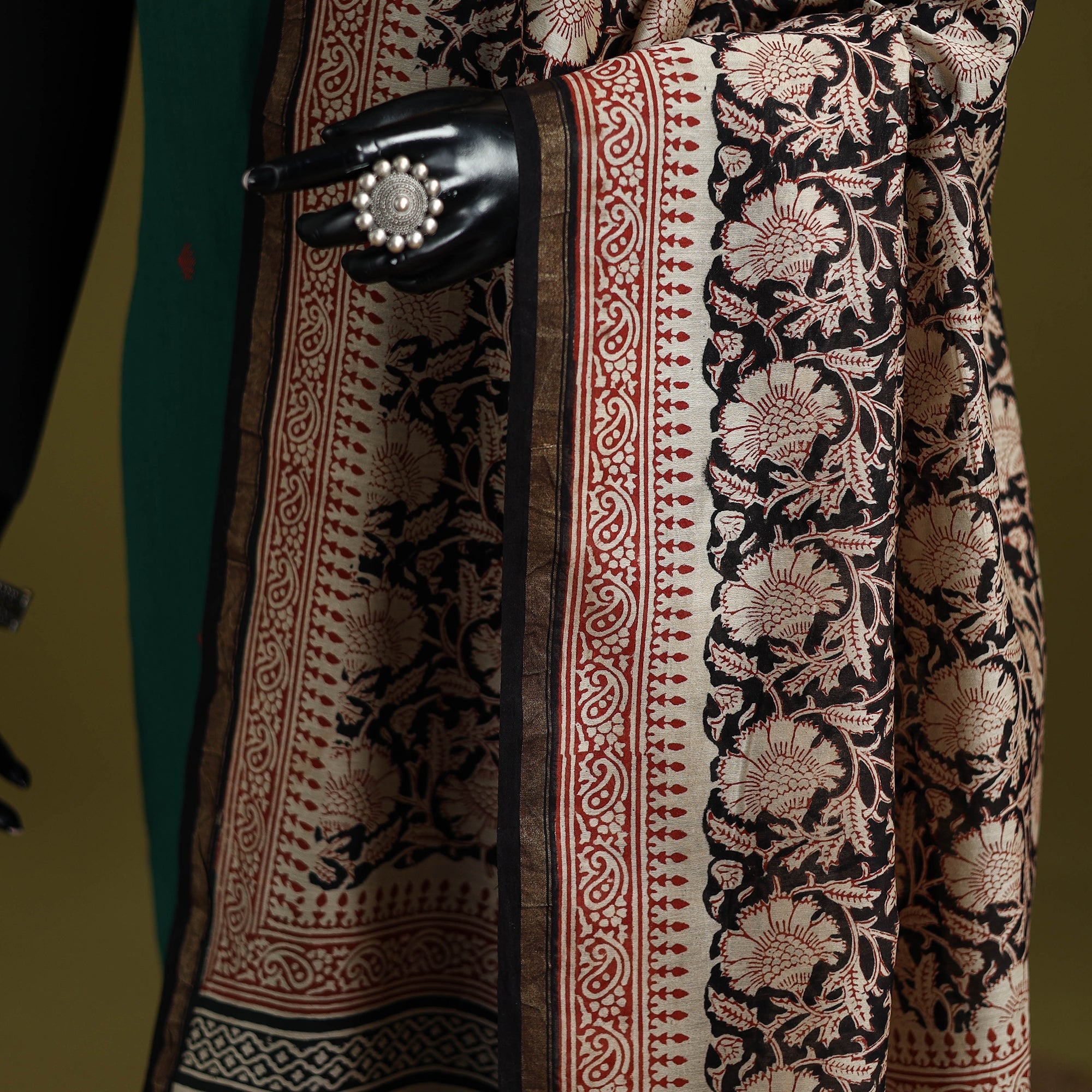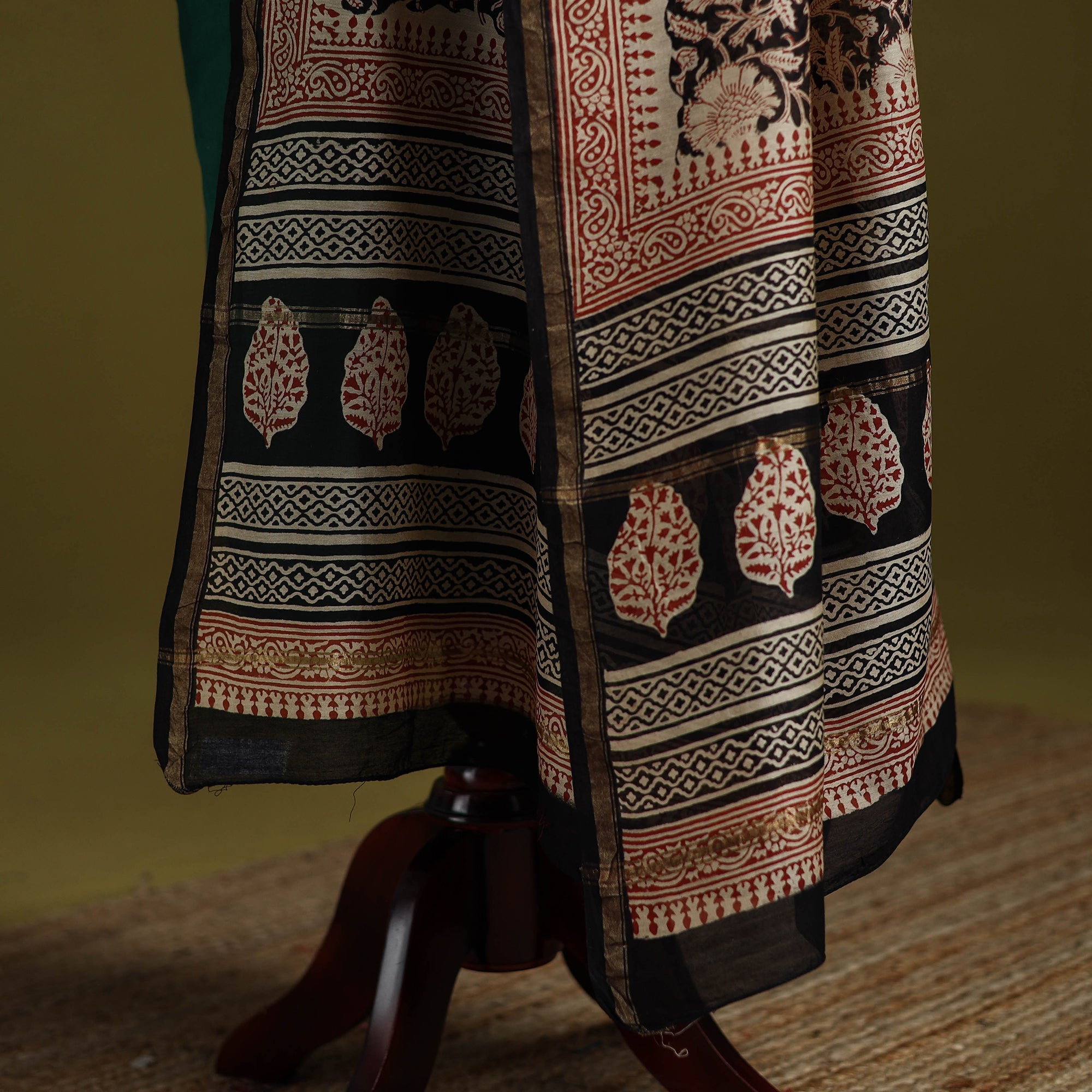 Experience the traditional artistry of Rajasthan with our black bagru hand block printed chanderi silk-cotton dupatta with zari border. This exquisite dupatta is made using natural dyes through the traditional mud resist process using hand-carved wooden blocks practiced in Bagru, Rajasthan. This versatile dupatta complements any outfit, making it a perfect accessory for casual outings or special events, effortlessly combining traditional craftsmanship with contemporary elegance.