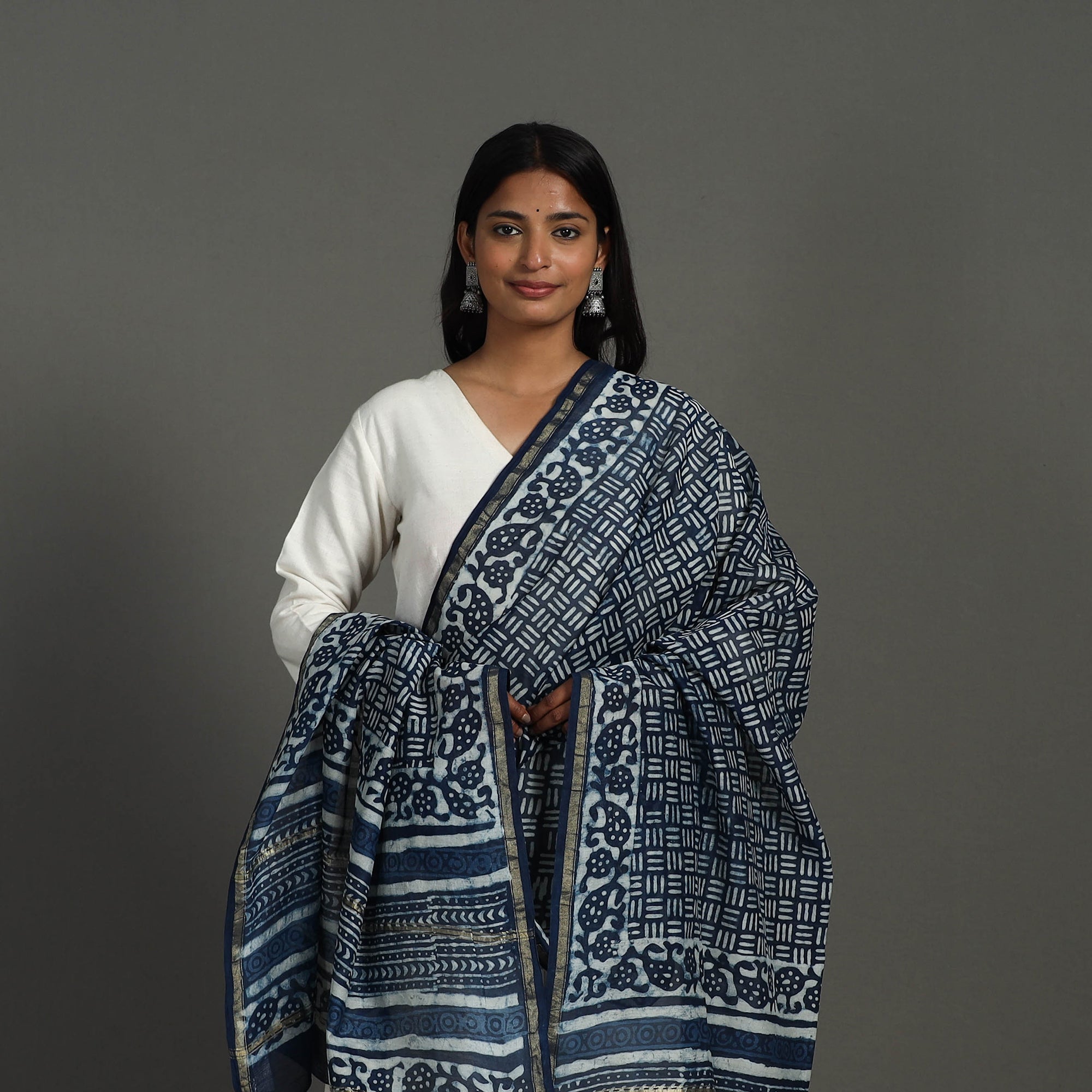 Blue - Indigo - Chanderi Silk Block Print Dabu Bagru Dupatta 02