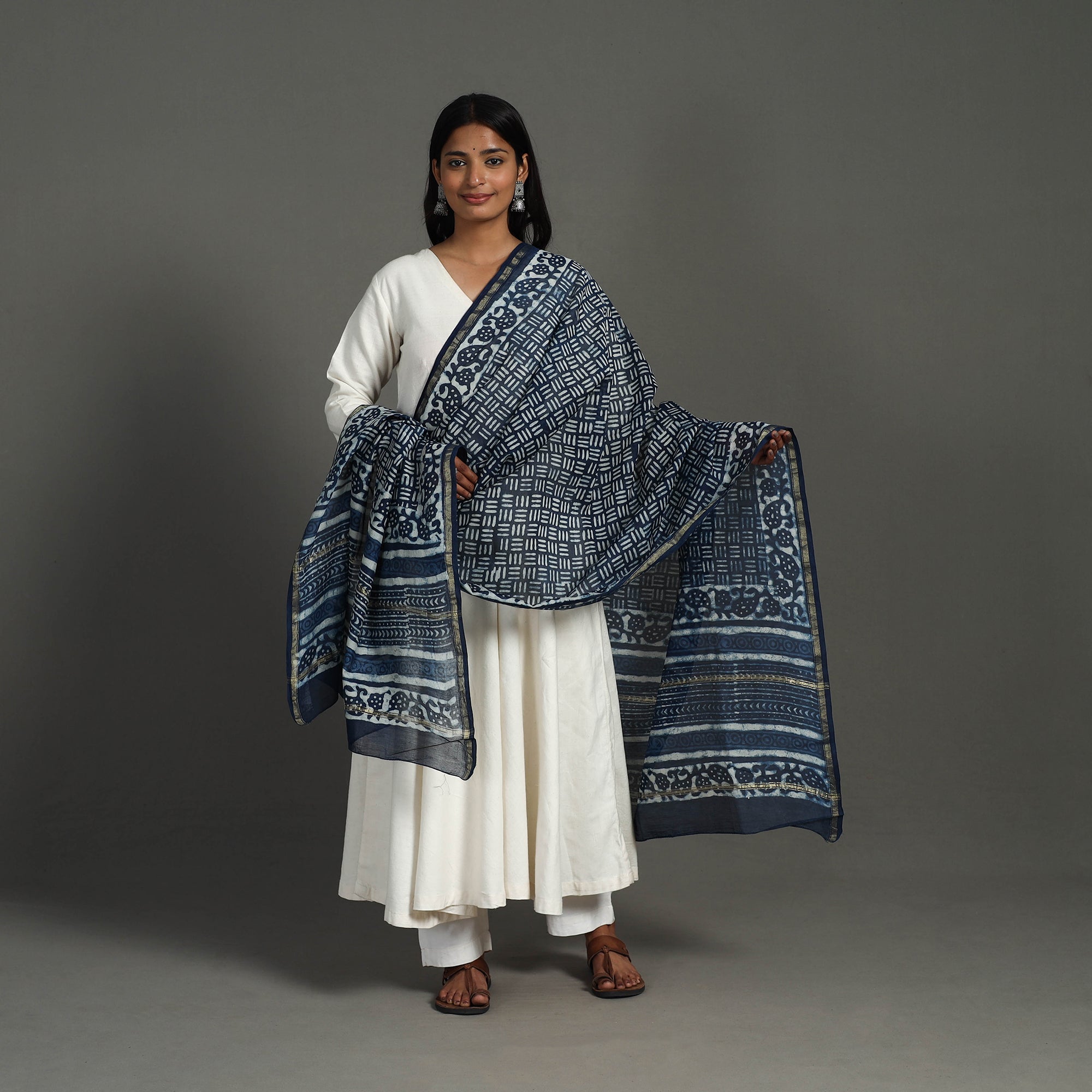 • Buy Indigo Chanderi Silk Block Print Dabu Bagru Dupatta