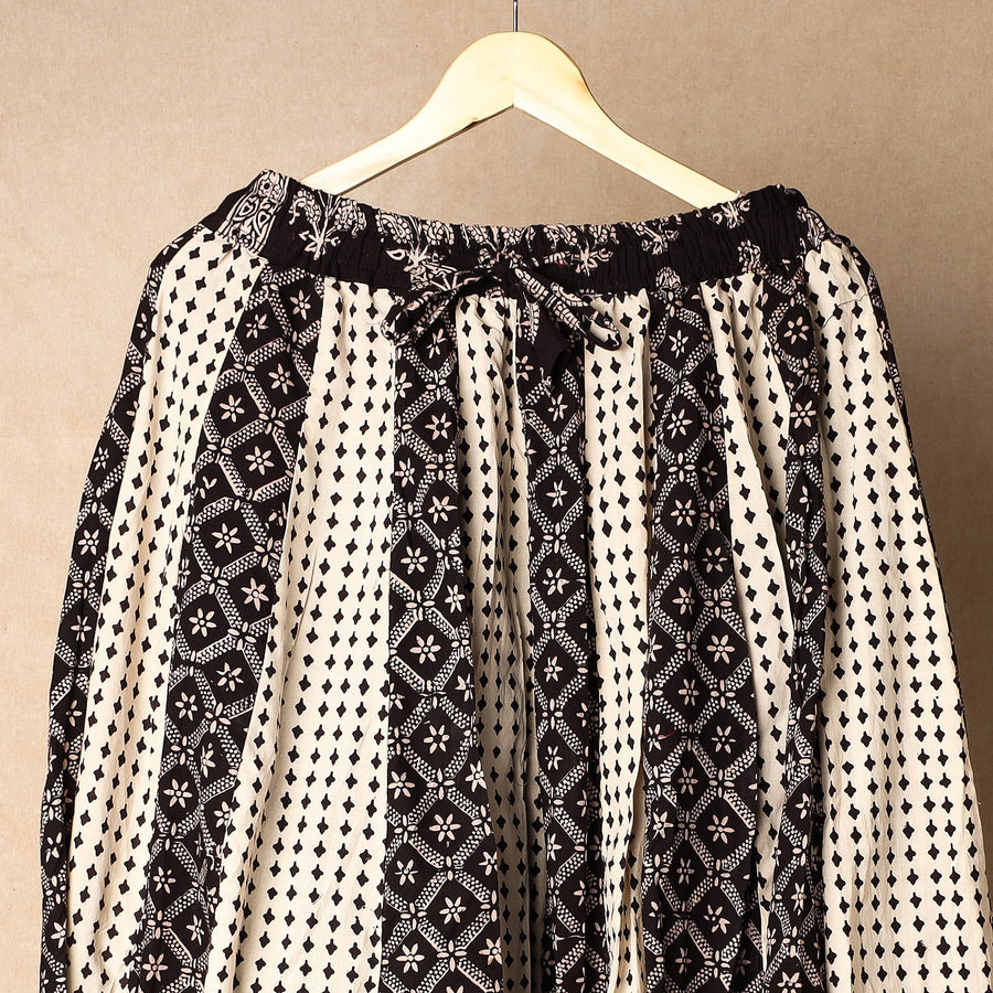 Fine quality bagh block printed cotton elasticated long skirt featuring a waist tie up closure, made using natural dyes through traditional processes by master craftsman practiced in Bagh, the Dhar district of Madhya Pradesh.