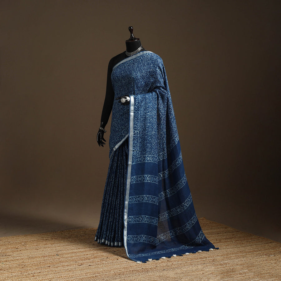 Elevate your style with our exquisite indigo sanganeri hand block printed linen handloom saree, adorned with tassels. Crafted from the finest bhagalpuri pure linen, this saree embodies timeless elegance. The lightweight linen ensures comfort, while the vibrant colours and meticulous craftsmanship make it a statement piece. The traditional hand block printing technique from Sanganer, Jaipur, imparts a unique touch, showcasing intricate designs. Embrace tradition with every wear, celebrating the rich cultural heritage of Sanganer. Elevate your wardrobe with this artisanal masterpiece, a testament to craftsmanship and style.