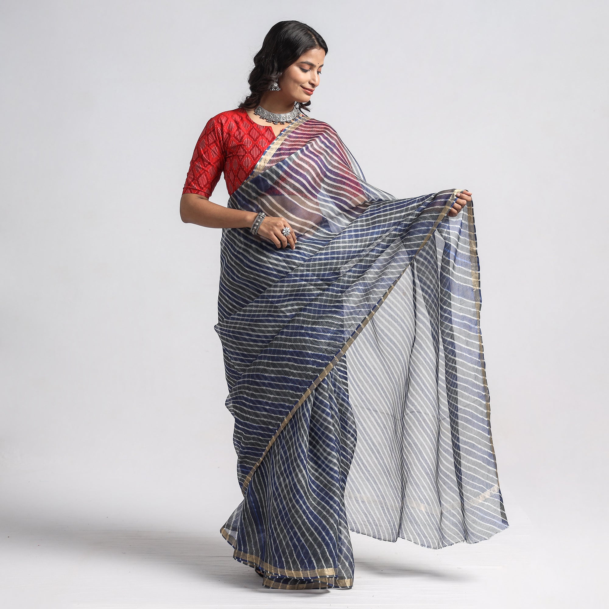 This exquisite blue leheriya tie-dye kota doria silk saree is a masterpiece crafted by the skilled artisan family of Badshah Miyan from the enchanting state of Rajasthan. This saree showcases the timeless beauty of the leheriya tie-and-dye technique, created through a traditional process. It's made from the finest-quality kota doria fabric, a blend of strong cotton and lustrous silk yarns. Kota doria is a traditional Indian textile that originates from the Kota district of Rajasthan. The fabric's lightweight and sheer texture lend it an ethereal charm, making it perfect for elegant draping and comfortable wear. The check patterns of the Kota doria fabric are created by finely interweaving threads, giving the saree a distinctive and graceful look.