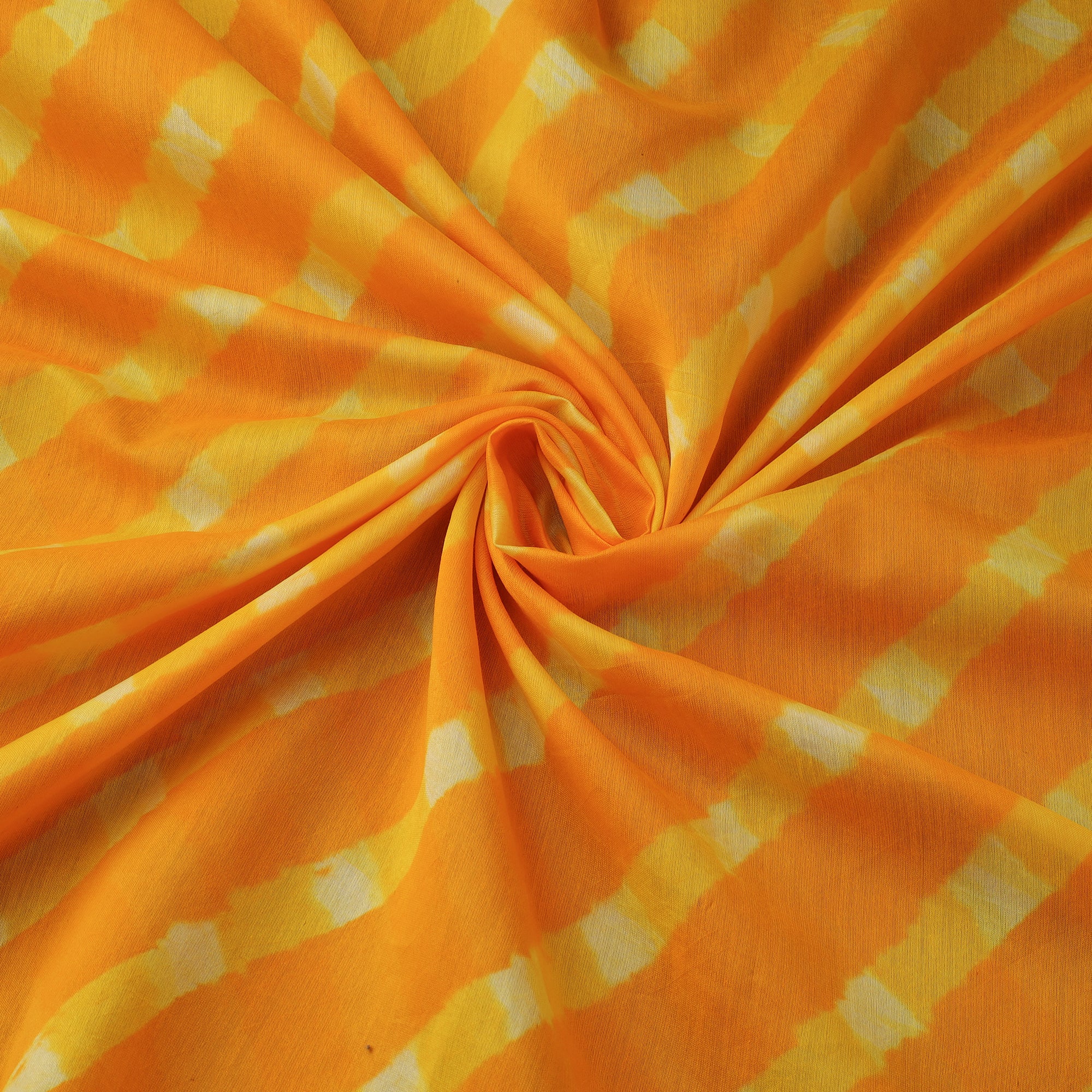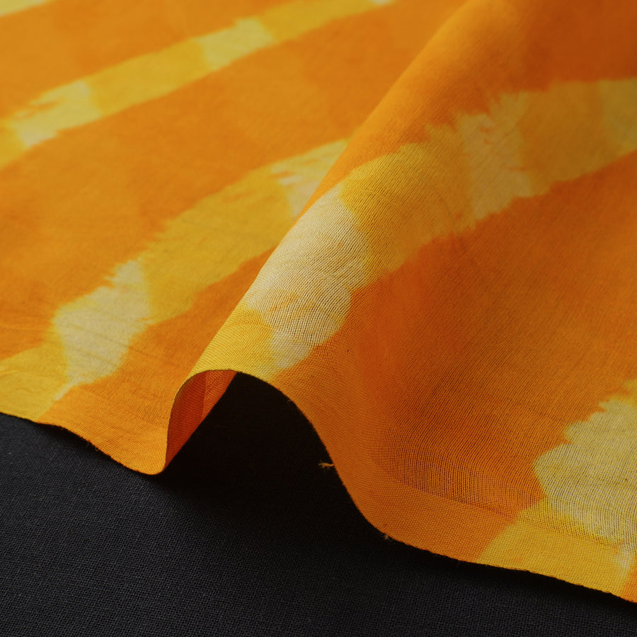 Finest quality orange leheriya tie-dye mothra chanderi silk-cotton fabric. The wavy patterns on this fabric have been dyed using the leheriya tie and dye technique through the traditional process by the master artisan family of Badshah Miyan from the state of Rajasthan. Azo free dye has been used to make this fabric. Chanderi silks are known for its gossamer looks and amazing feel.