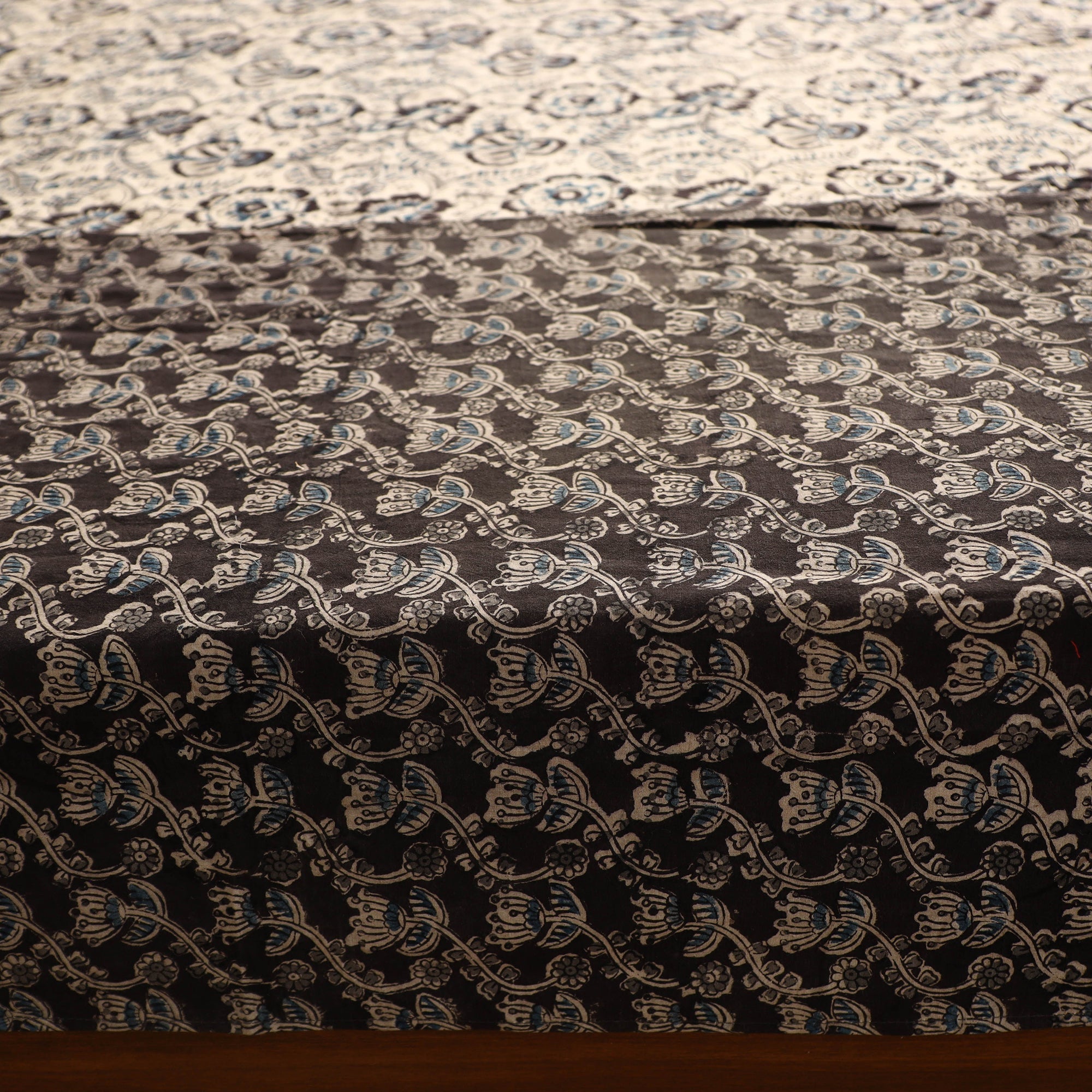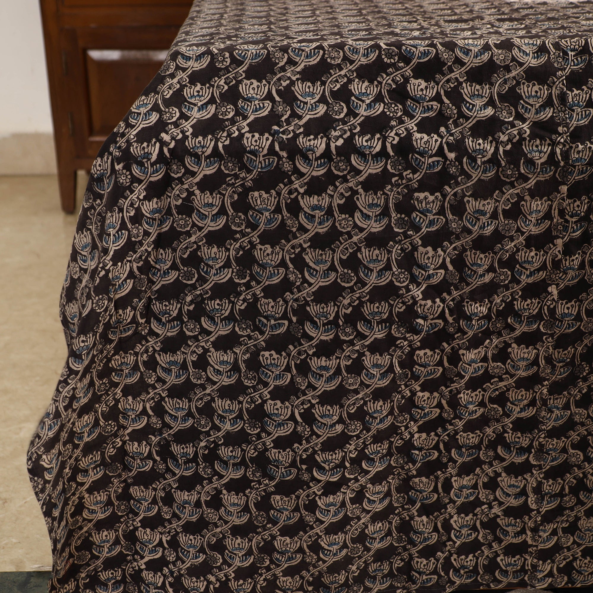 Transform your bedroom into a sanctuary of style and comfort with our black kalamkari block printed patchwork cotton double bed cover. This meticulously designed bedcover, featuring traditional block printing and intricate patchwork, elevates your home decor with traditional elegance. Crafted from natural dyed cotton fabric, it not only enhances aesthetics but also ensures a luxurious and restful night's sleep, providing a haven of serenity in your personal space.