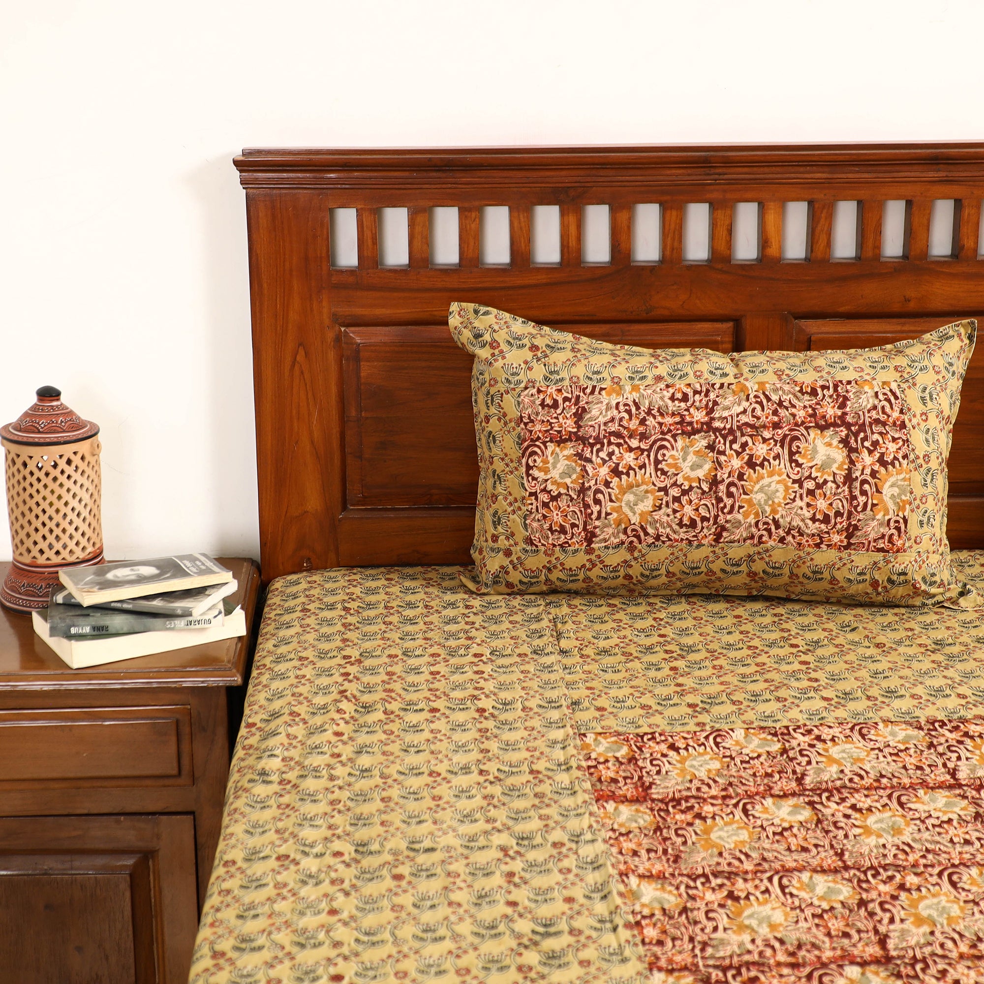 Transform your bedroom into a sanctuary of style and comfort with our yellow kalamkari block printed patchwork cotton double bed cover. This meticulously designed bedcover, featuring traditional block printing and intricate patchwork, elevates your home decor with traditional elegance. Crafted from natural dyed cotton fabric, it not only enhances aesthetics but also ensures a luxurious and restful night's sleep, providing a haven of serenity in your personal space.