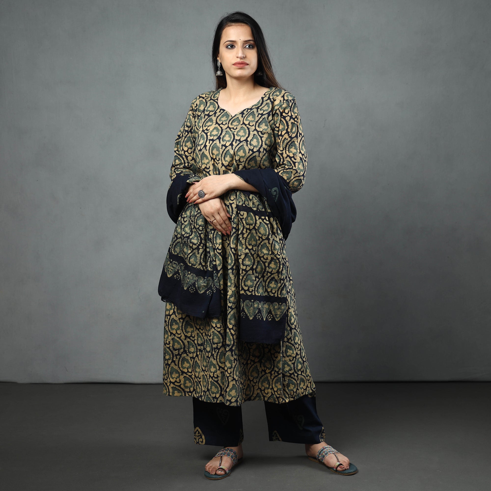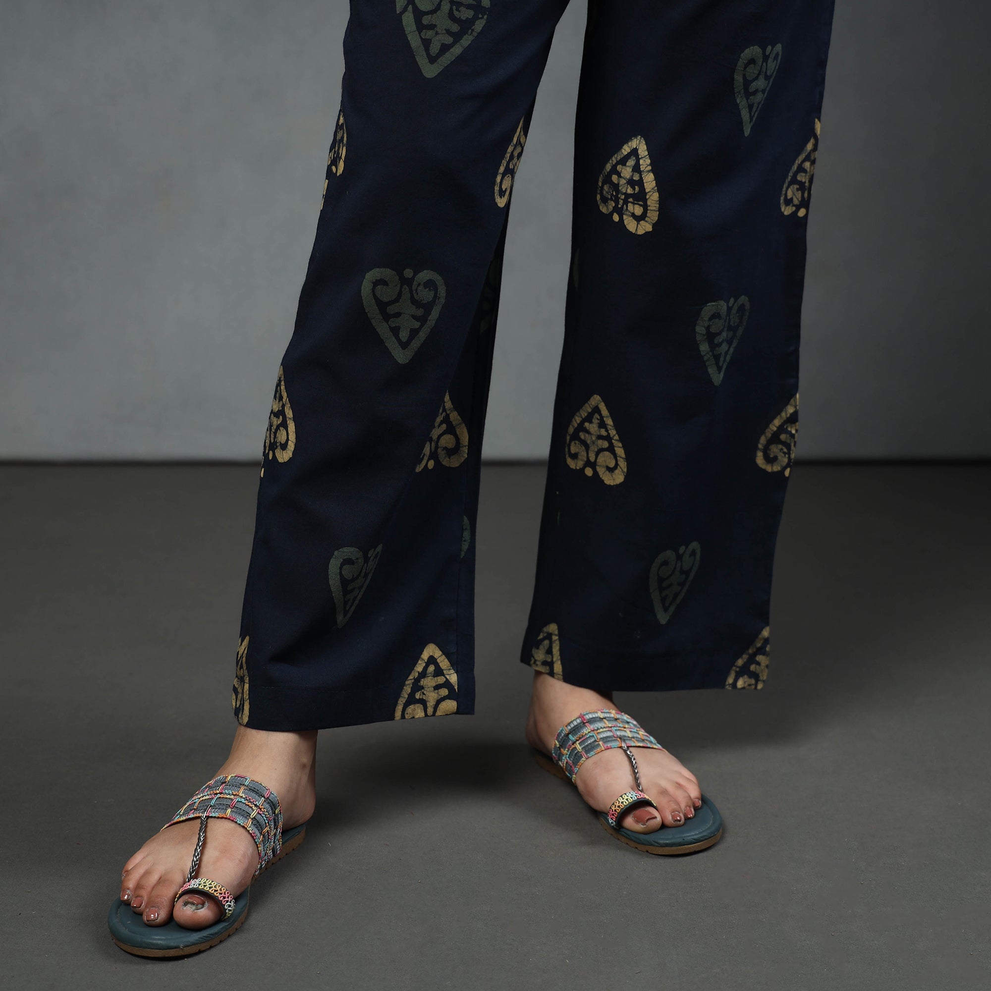 This hand-batik printed cotton suit is a perfect choice for a special occasion. The long kurta with side pockets and dupatta is uniquely designed and sure to make you look beautiful. The cotton palazzo completes the set, making it comfortable to wear for extended periods. Batik is a technique of wax-resist dyeing applied to whole cloth, or cloth made using this technique. The traditional designs and motifs in Indian batik are often passed down from one generation to another.