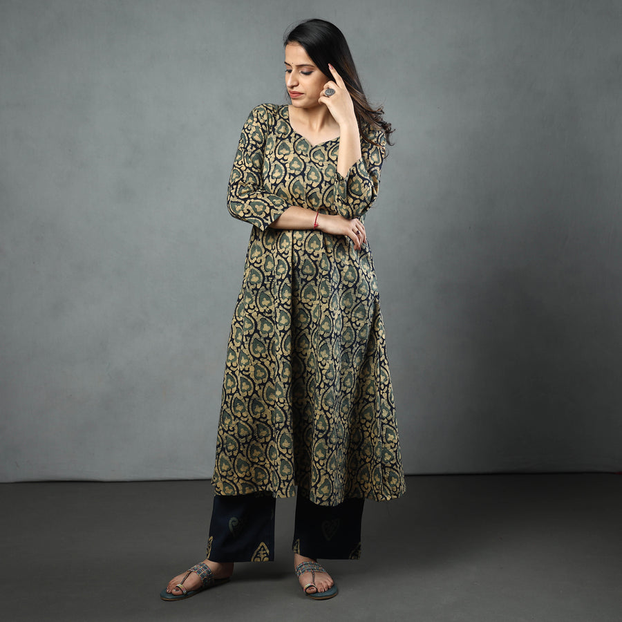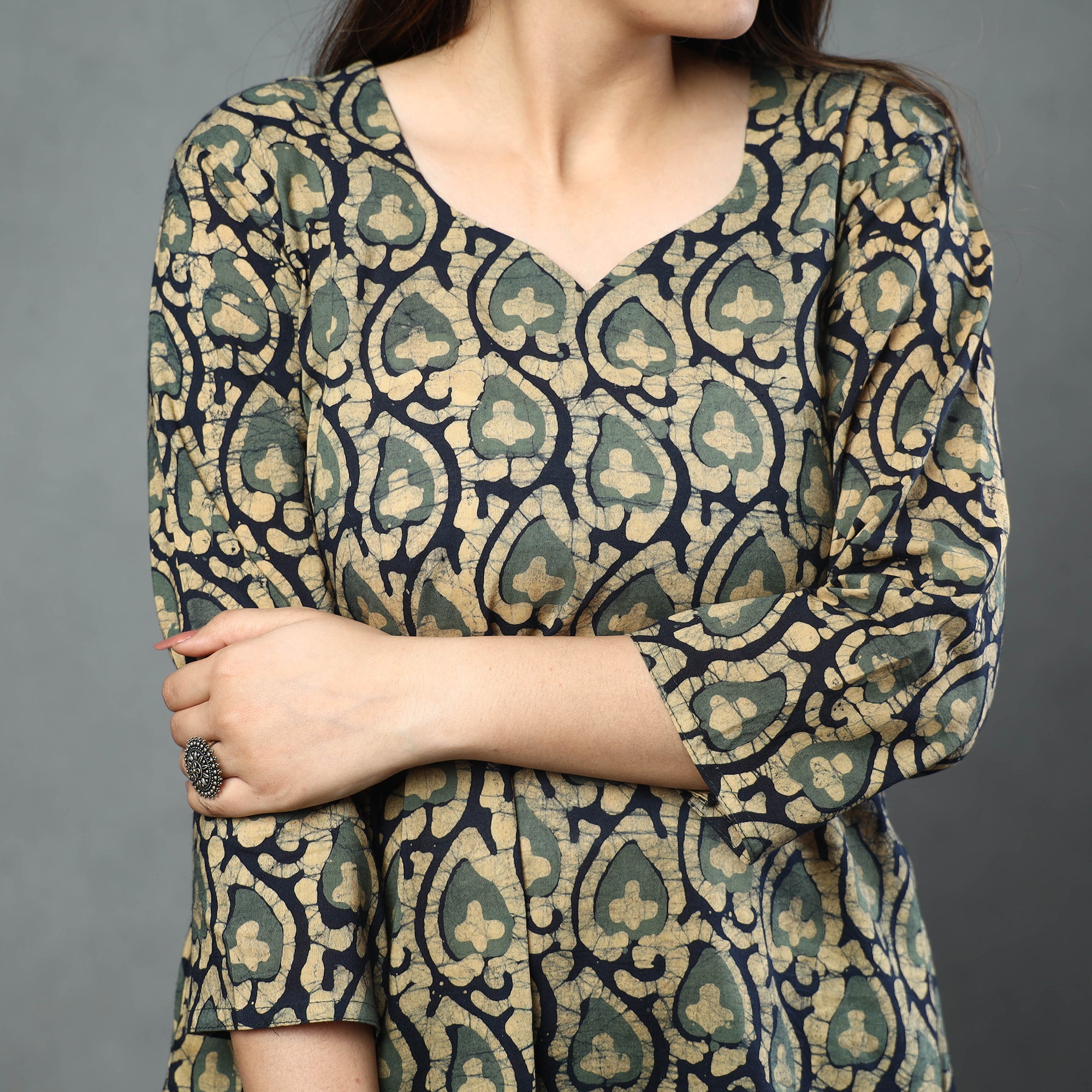 Green - Hand Embroidery Cotton A-Line Batik Print Kurta for women 04