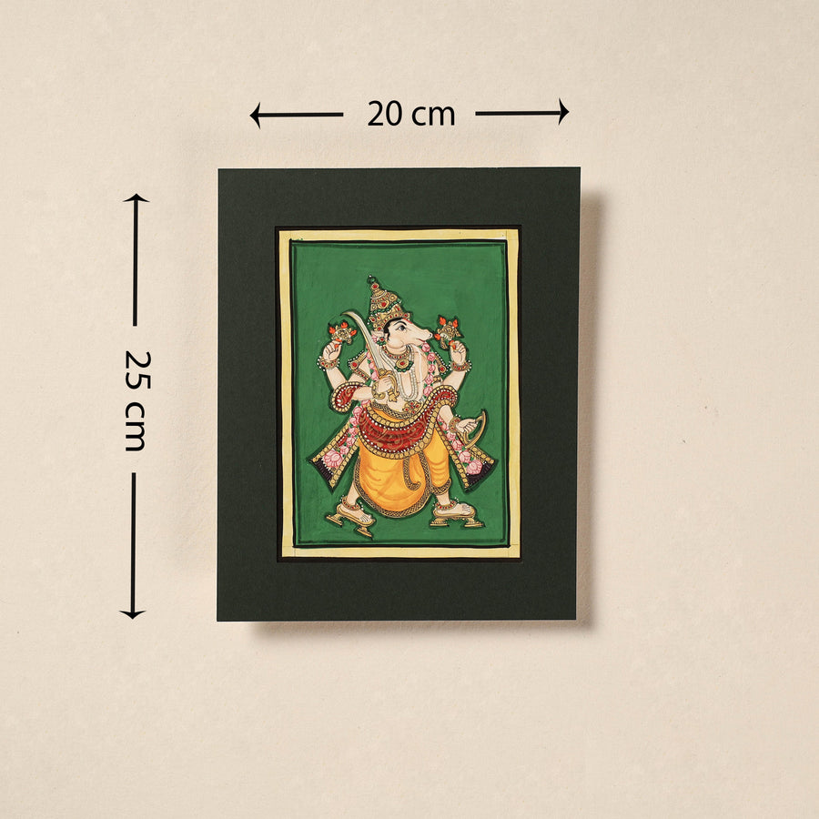Traditional hand-painted painting with natural colours on archival paper with a hard paper mount. Mount can be changed as required. This classical South Indian art comes from Mysore, from the family of JS Sridhar Rao. A wonderful painting for the discerning decor aficionado or a gift for an art lover. These are priceless collectibles. Mysore painting is an important form of classical South Indian painting that originated in and around the town of Mysore in Karnataka. Mysore paintings are known for their elegance, muted colours, and attention to detail. The themes for most of these paintings are Hindu gods and goddesses and scenes from Hindu mythology. Mysore paintings are characterised by delicate lines, intricate brush strokes, graceful delineation of figures, and the discreet use of bright vegetable colours and lustrous gold leaf.