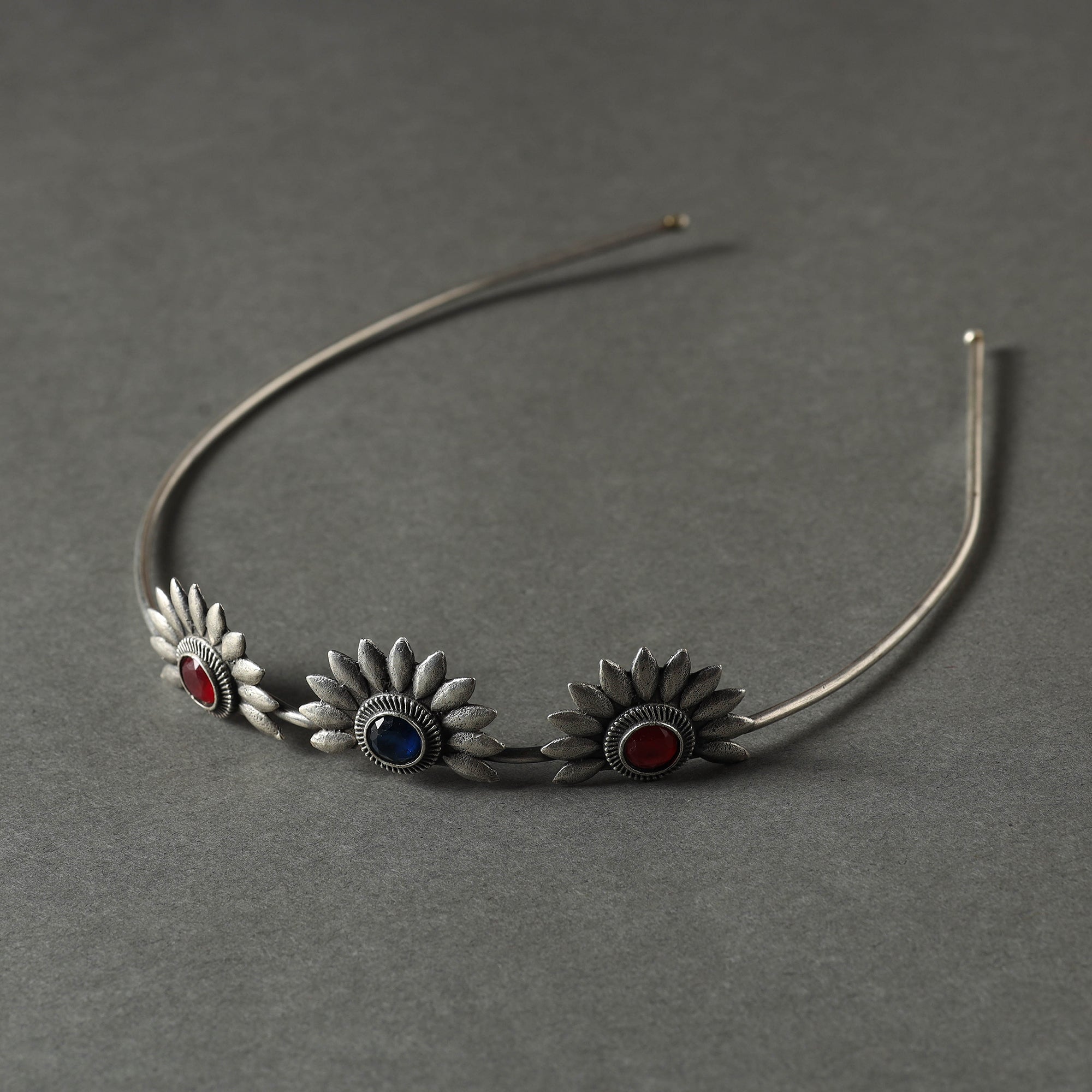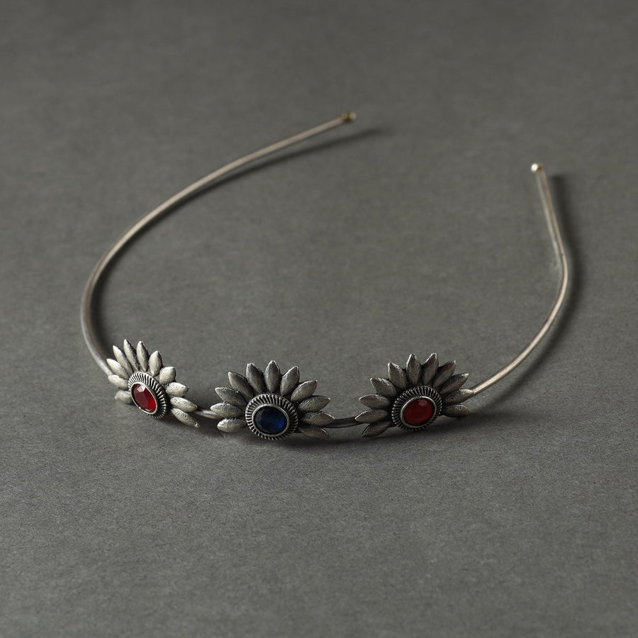 This exquisite antique silver finish stone work hair band, made with a high-quality oxidised brass base, radiates elegance and charm. The rustic shine effect enhances its allure, making it a timeless accessory that adds a touch of sophistication to any hairstyle.