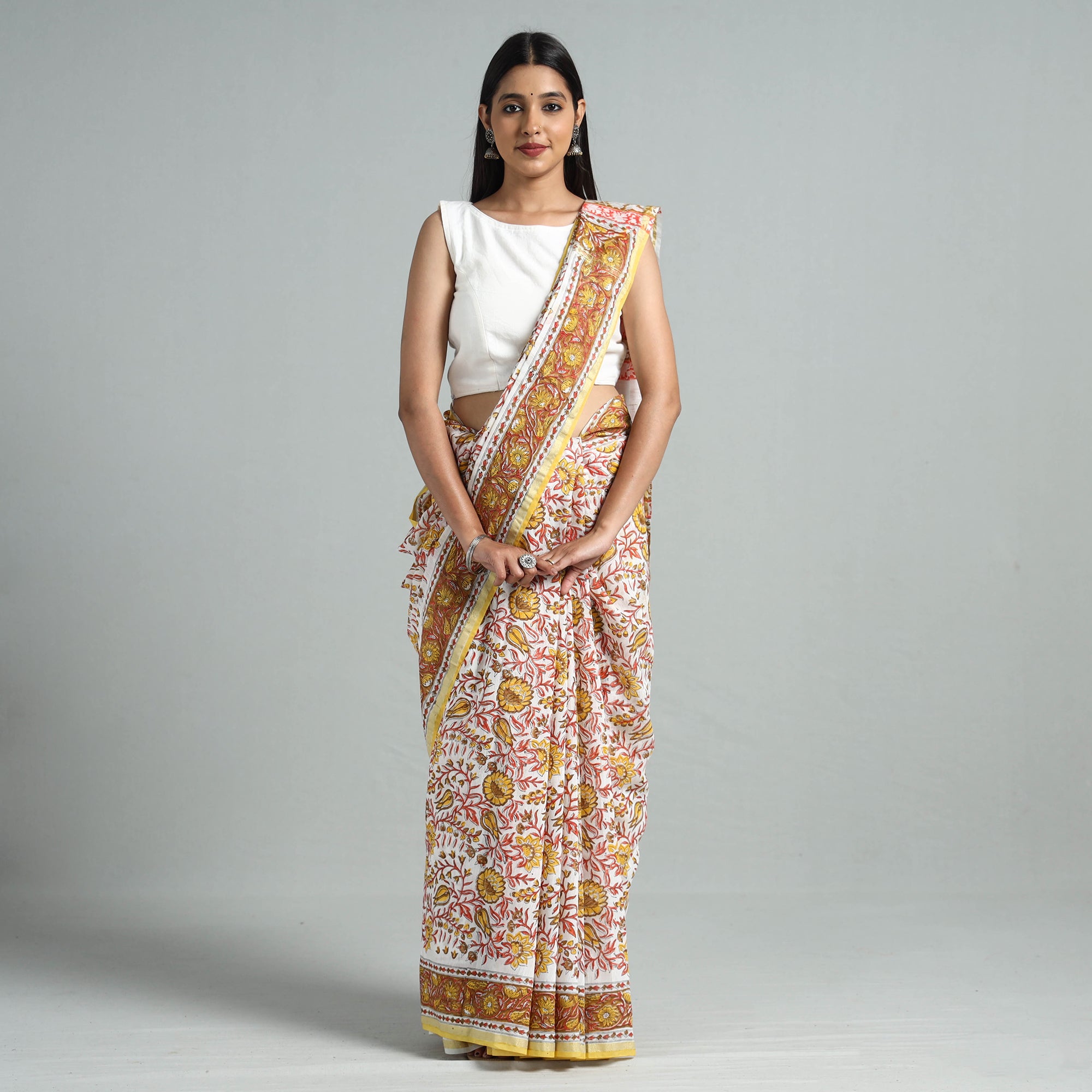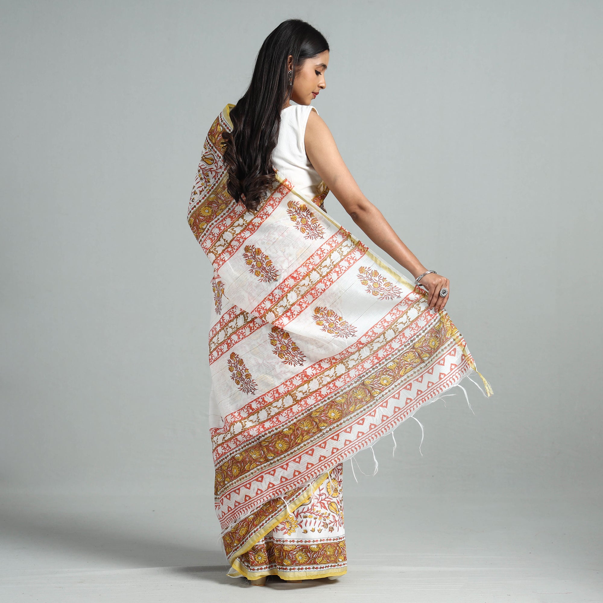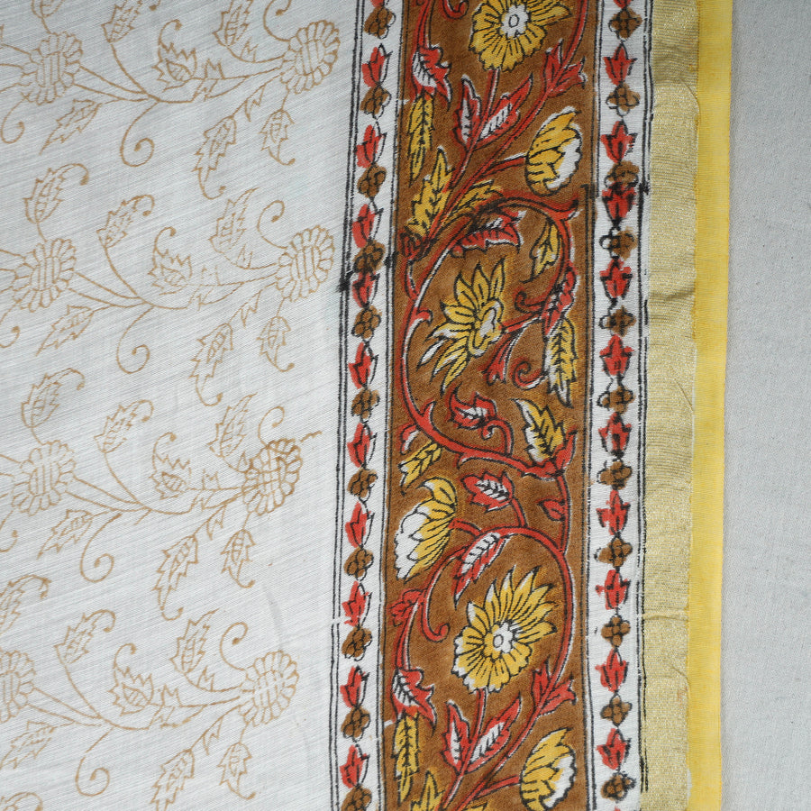 Experience the rich tradition of Rajasthan with our multicolor sanganeri hand-block printed chanderi silk-cotton saree with zari border. This exquisite saree is made using traditional hand block printing technique from Sanganer, Jaipur, imparts a unique touch, showcasing intricate designs. This saree seamlessly blends tradition with contemporary style, making it perfect for festive occasions. Embrace the artistry, drape it with pride, and celebrate the timeless allure of Sanganeri craftsmanship.