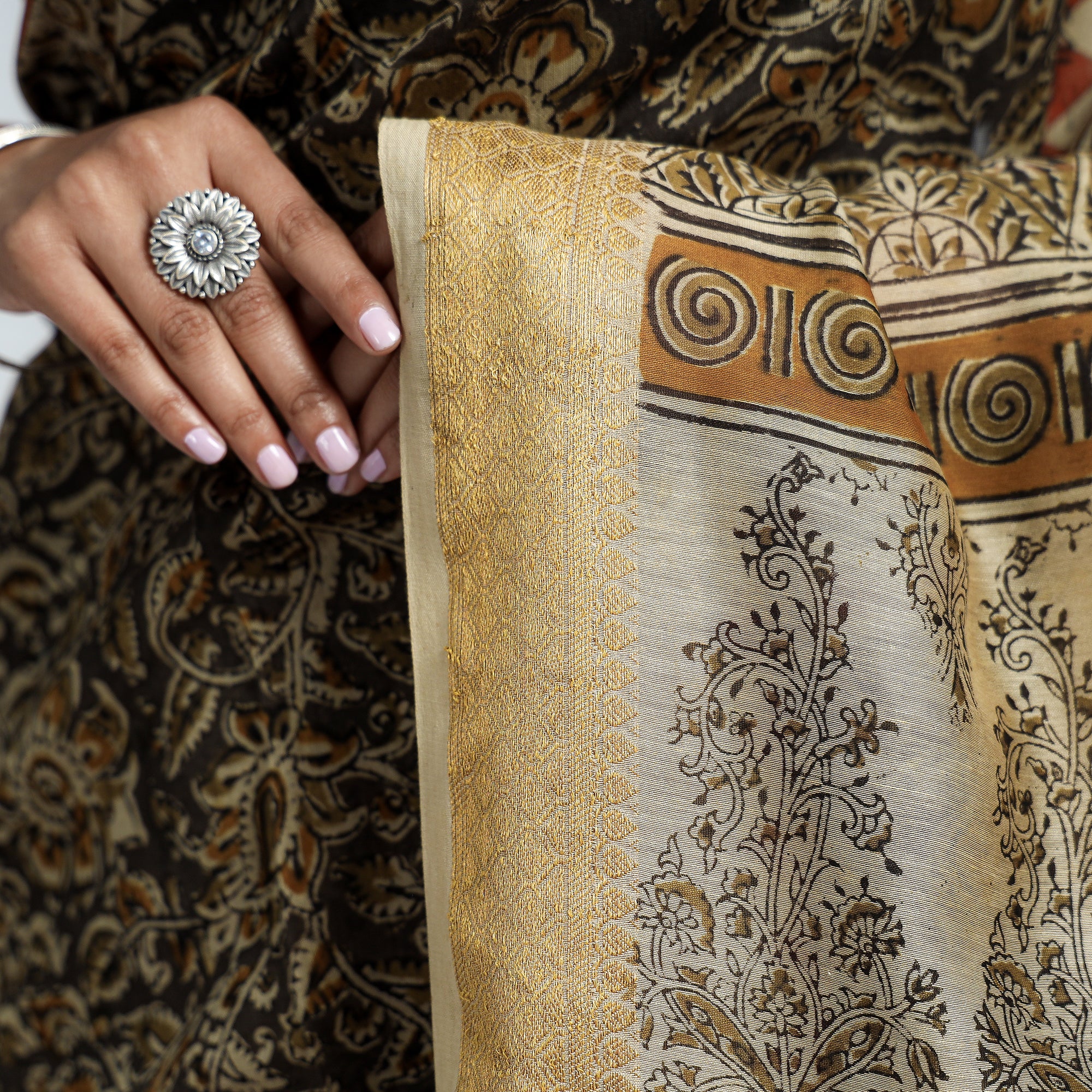 Kalamkari is a type of hand-painted or printed cotton fabric produced in Andhra Pradesh. This is a traditional printing method on cotton fabrics using natural materials without adding chemicals to cotton fabrics.