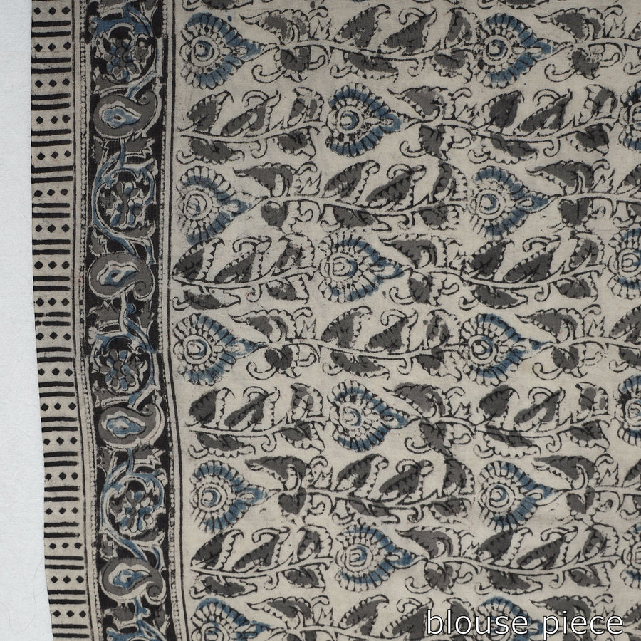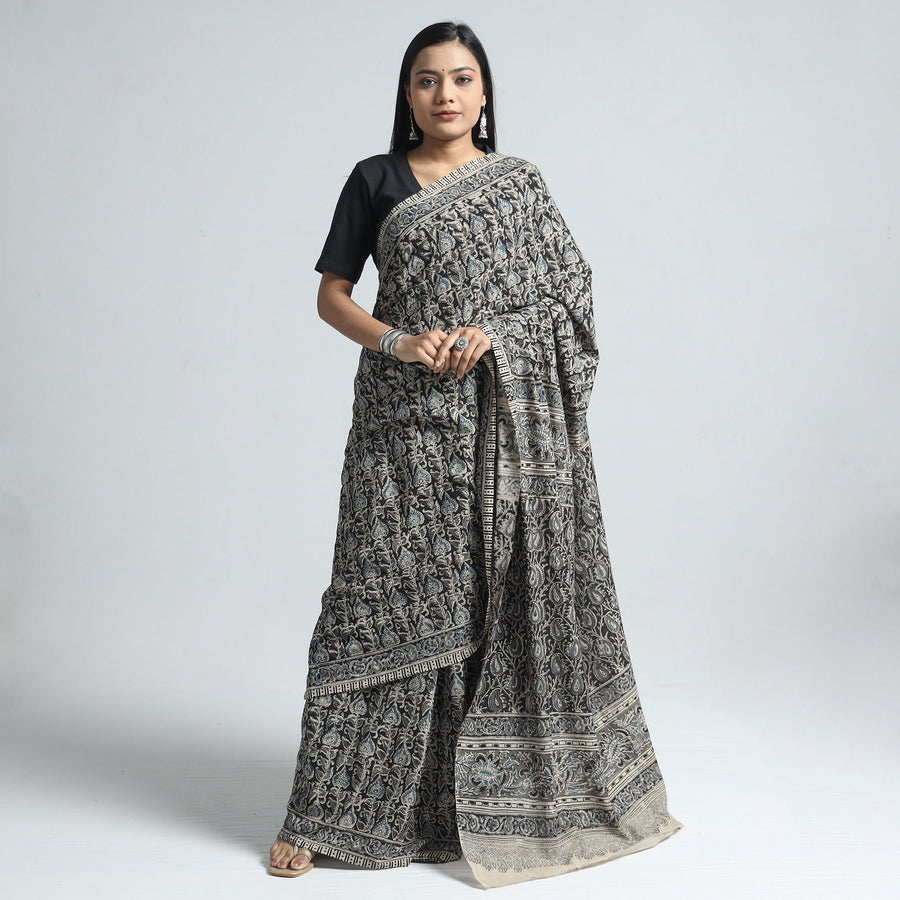 Fine-quality black Kalamkari saree with block-printed. This kalamkari cotton saree features intricate designs and natural dyes, reflecting the rich tradition of Kalamkari art. Perfect for special occasions, it combines elegance with comfort. Celebrate Indian craftsmanship and support local artisans with this unique piece.
