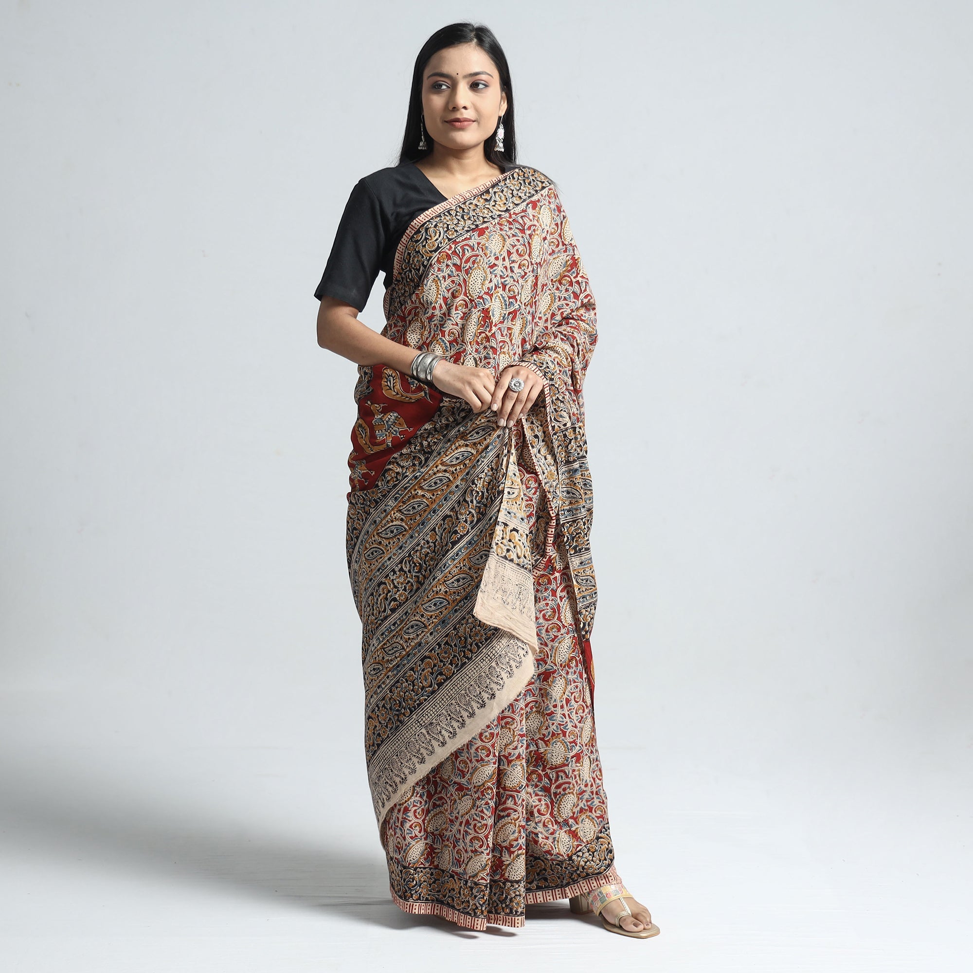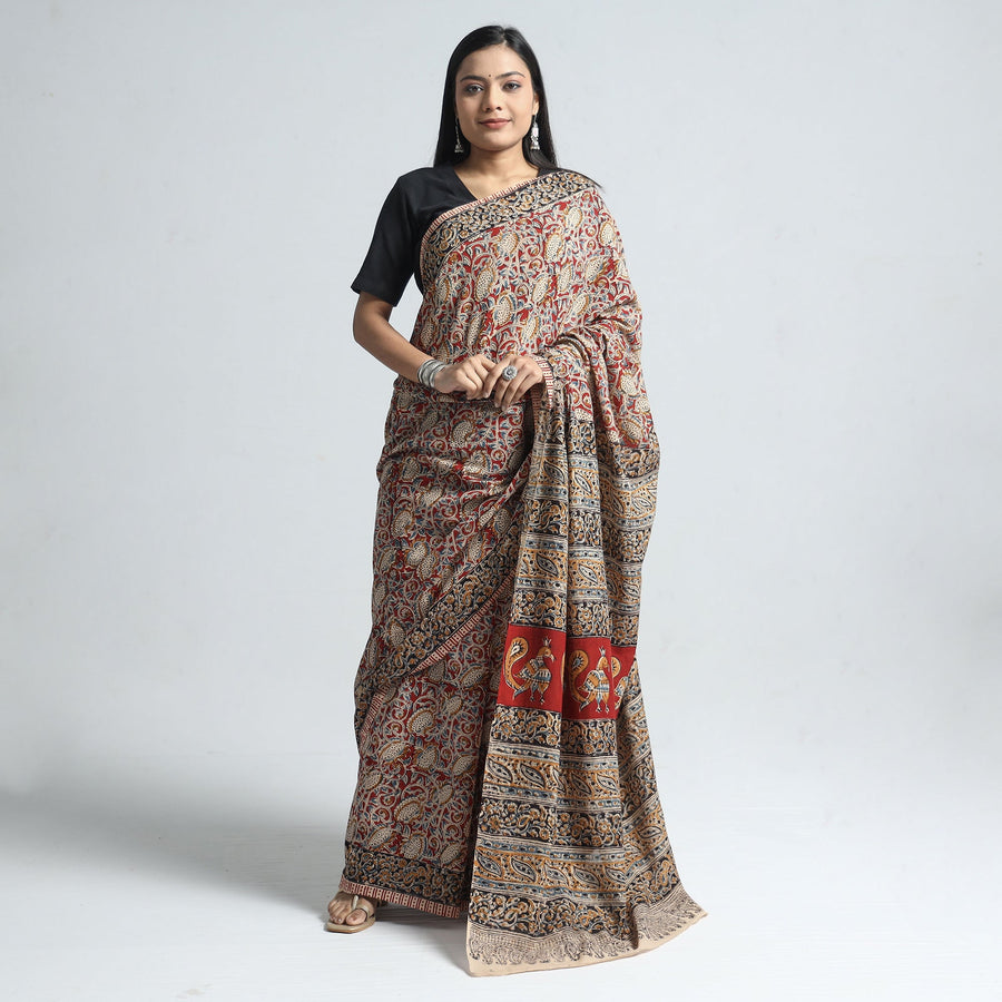 Fine-quality red Kalamkari saree with block-printed. This kalamkari cotton saree features intricate designs and natural dyes, reflecting the rich tradition of Kalamkari art. Perfect for special occasions, it combines elegance with comfort. Celebrate Indian craftsmanship and support local artisans with this unique piece.