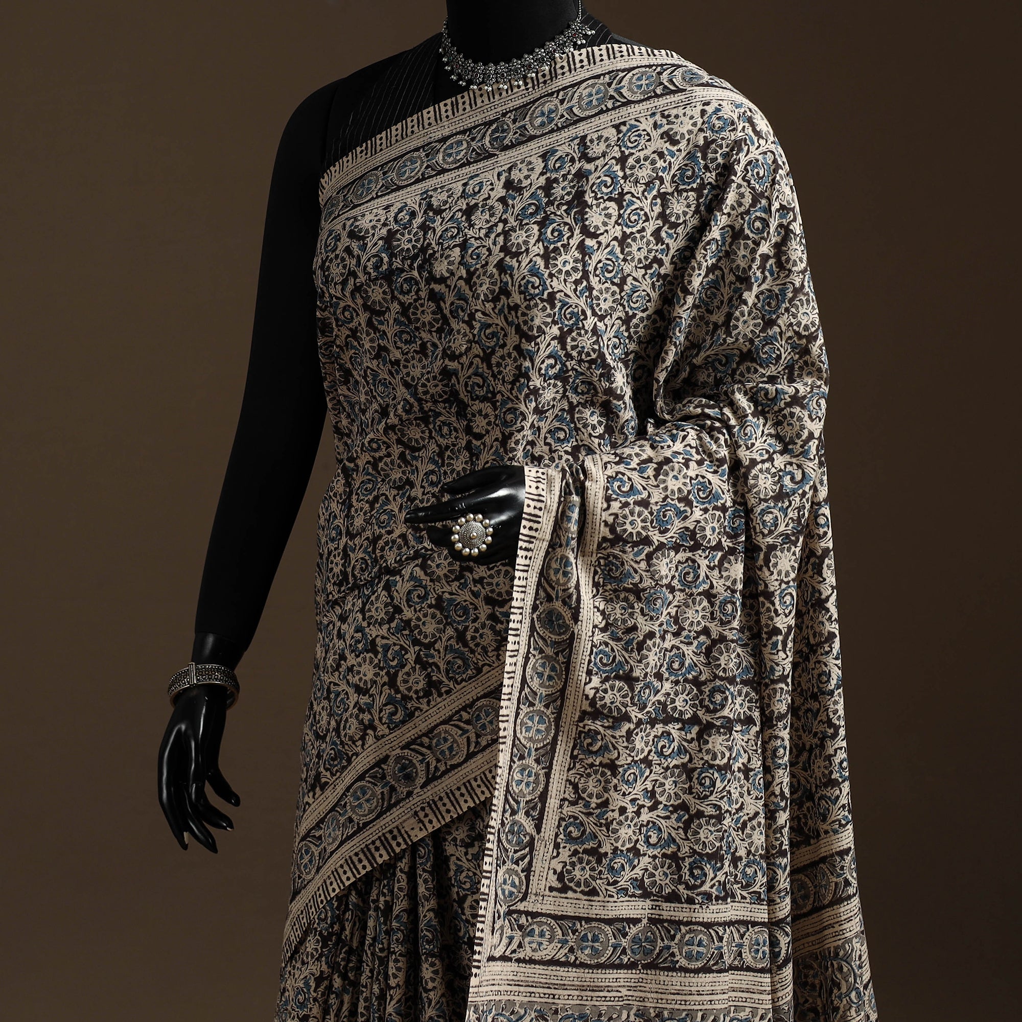 Fine-quality black Kalamkari saree with block-printed. This kalamkari cotton saree features intricate designs and natural dyes, reflecting the rich tradition of Kalamkari art. Perfect for special occasions, it combines elegance with comfort. Celebrate Indian craftsmanship and support local artisans with this unique piece.