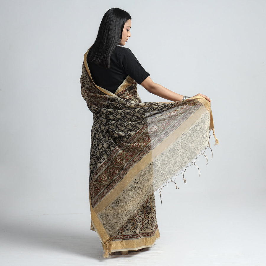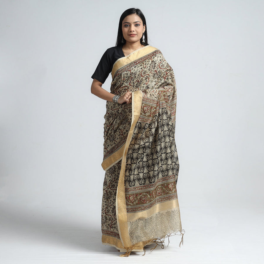 Experience the elegance of our original pedana beige kalamkari saree. Hand block printed with intricate designs and a stunning zari border, this saree blends tradition with luxury. Crafted from chanderi silk, it features the timeless art of Kalamkari, perfect for any special occasion.