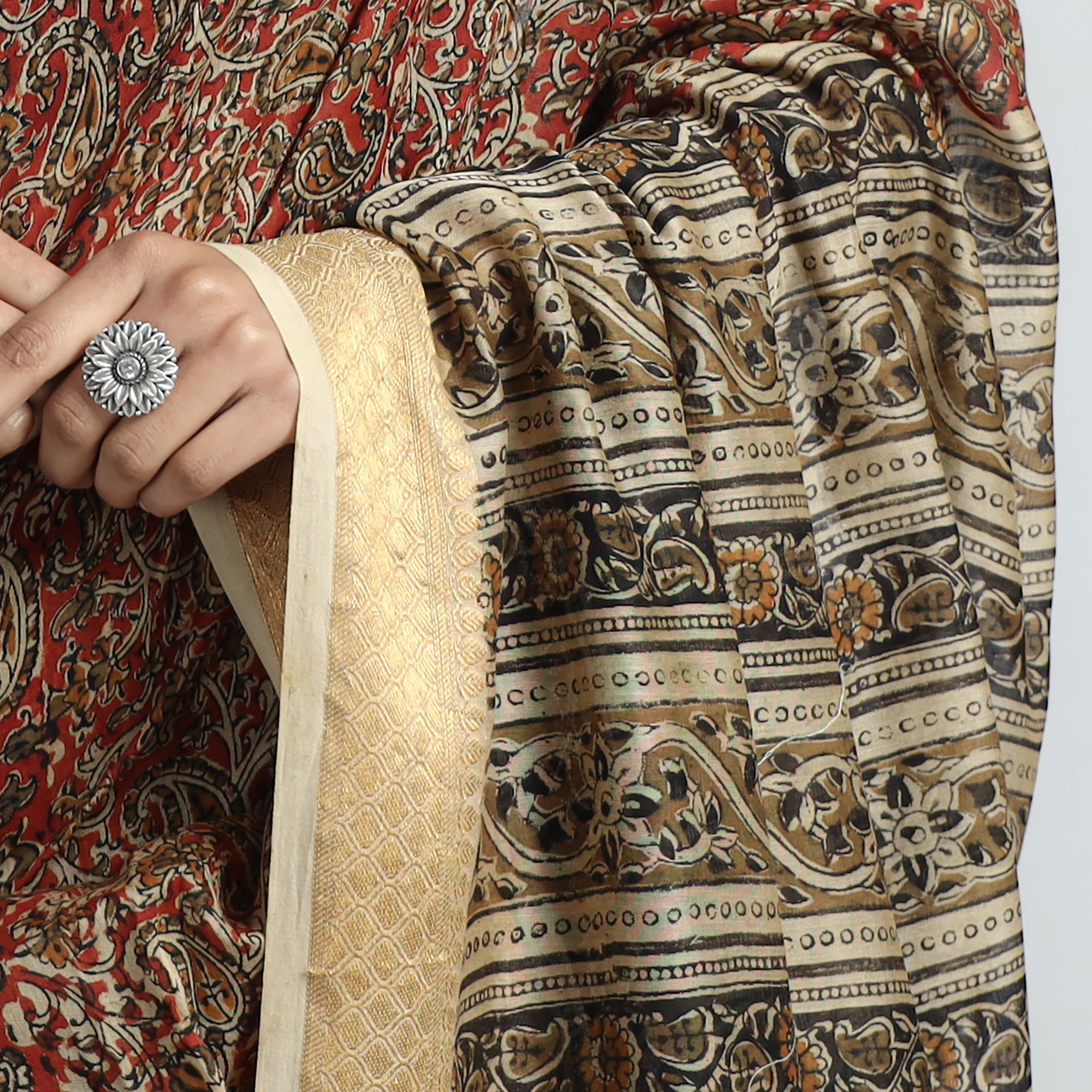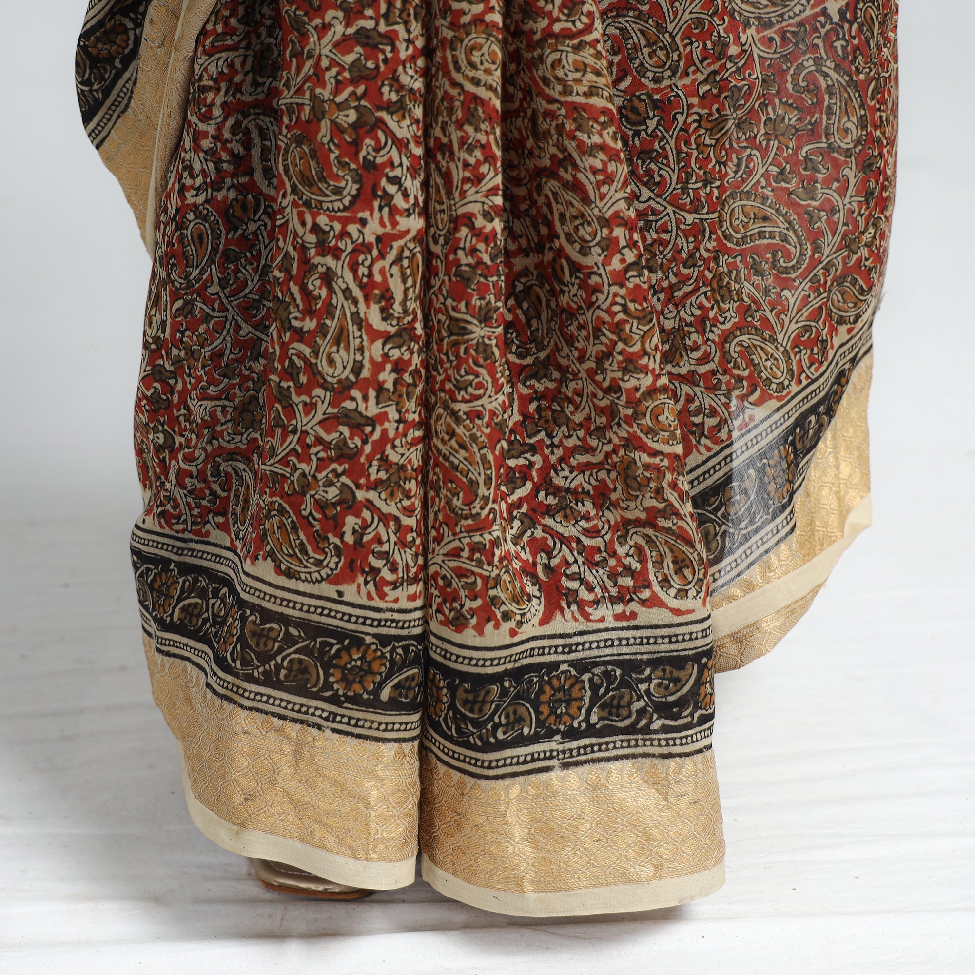 Experience the elegance of our original red pedana kalamkari saree. Hand block printed with intricate designs and a stunning zari border, this saree blends tradition with luxury. Crafted from chanderi silk, it features the timeless art of Kalamkari, perfect for any special occasion.