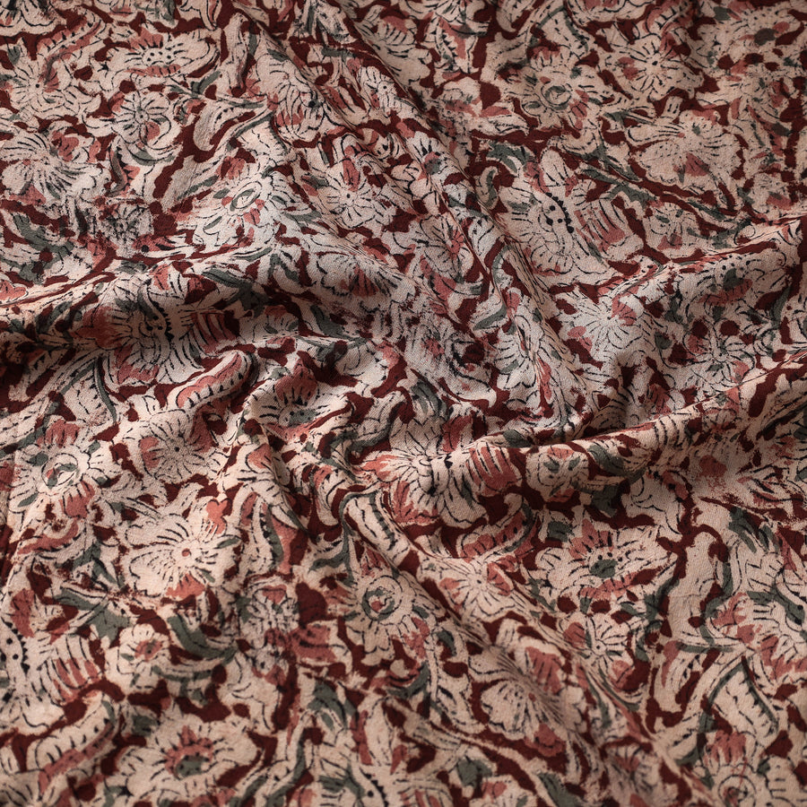 Indulge in the rich artistry of kalamkari with this fine quality cotton fabric. Hand block printed using natural dyes, this fabric showcases an array of traditional motifs inspired by kalamkari painting. The intricate detailing and complex techniques used by artisans from Andhra Pradesh make this fabric a masterpiece. Perfect for creating stunning apparel, home decor, or accessories with a touch of traditional elegance. Elevate your style with this exquisite Kalamkari block printed cotton fabric.