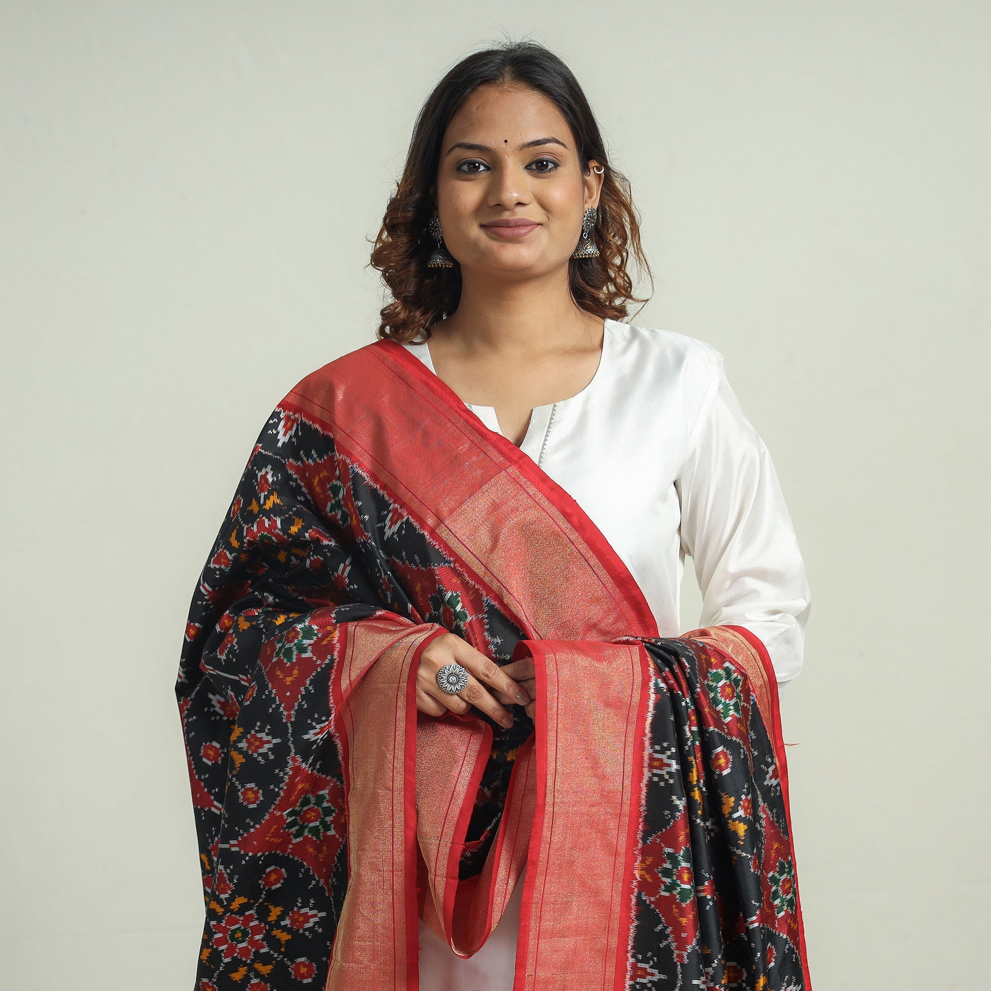 Fine quality pure handspun handwoven pochampally ikat silk dupatta with zari border from Telangana. Ikat (Ikkat) is a dyeing technique used to pattern textiles that employs a resist dyeing process similar to tie-dye on either the warp or weft fibers prior to dyeing. Ikat has lovely patterns and are world famous for their extremely beautiful colors, texture and designs. Indian Ikat is always admired by the fashion designers around the world. Adorned with chic tassels, it effortlessly enhances both casual and formal ensembles, adding a touch of cultural charm and elegance to your wardrobe.
