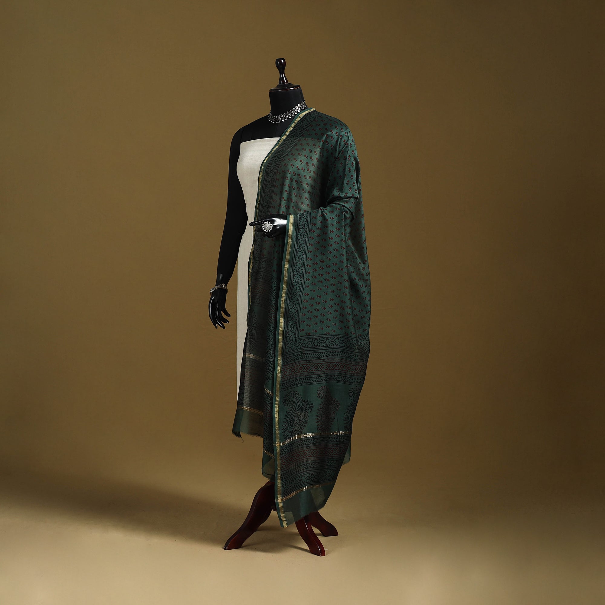 Elevate your style effortlessly with our green bagh block-printed chanderi silk cotton dupatta, a fine creation by artisan Yakub Khatri from Bagh, the Dhar district of Madhya Pradesh. Meticulously crafted traditional handblock printing, this versatile masterpiece adds a touch of heritage and sophistication to any outfit, whether casual or festive. Experience the timeless charm of artisanal craftsmanship, which makes every outfit a celebration of elegance and cultural richness.