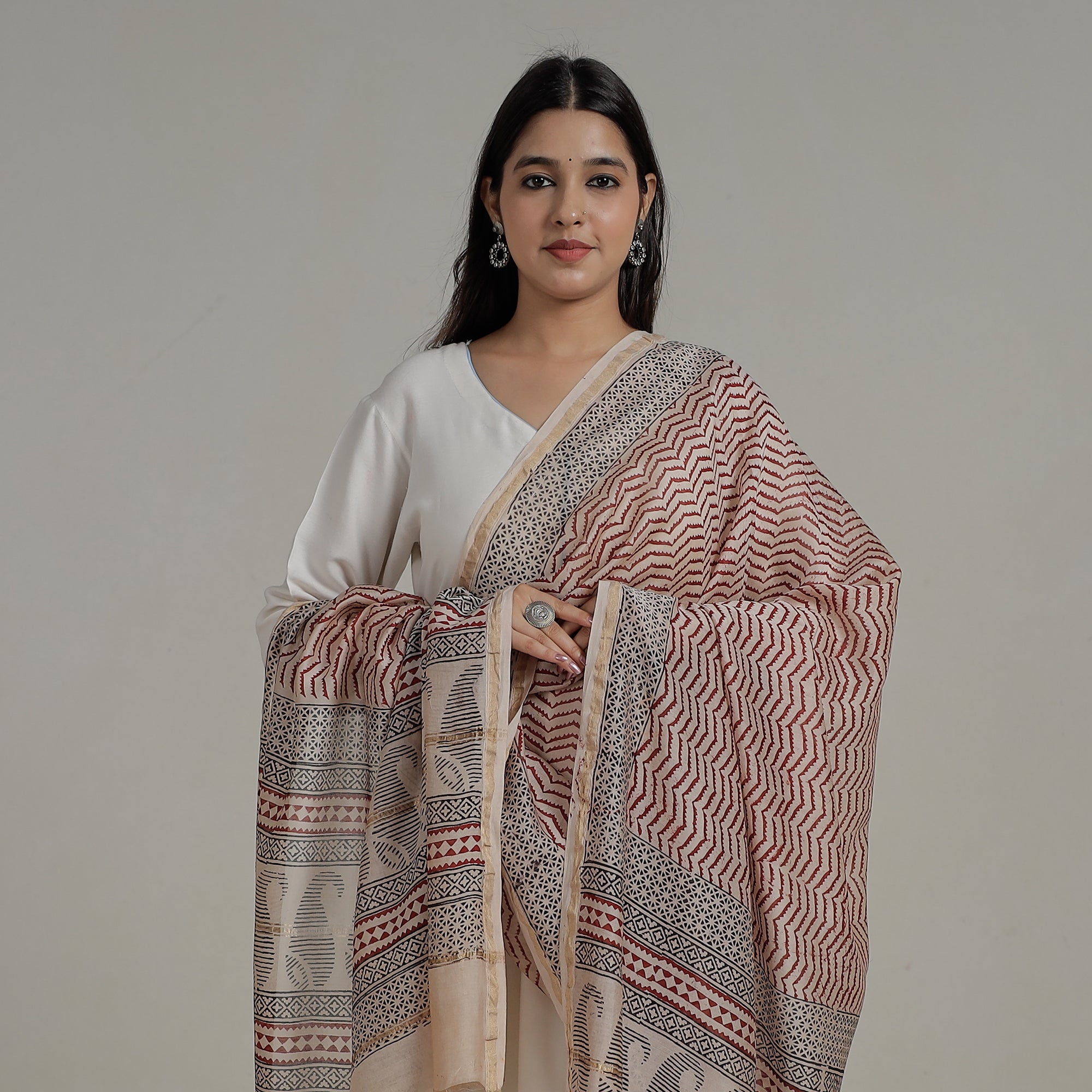 | Material | Elevate your style effortlessly with our red bagh block-printed chanderi silk cotton dupatta, a fine creation by artisan Yakub Khatri from Bagh, the Dhar district of Madhya Pradesh. Meticulously crafted traditional handblock printing, this versatile masterpiece adds a touch of heritage and sophistication to any outfit, whether casual or festive. Experience the timeless charm of artisanal craftsmanship, which makes every outfit a celebration of elegance and cultural richness. |