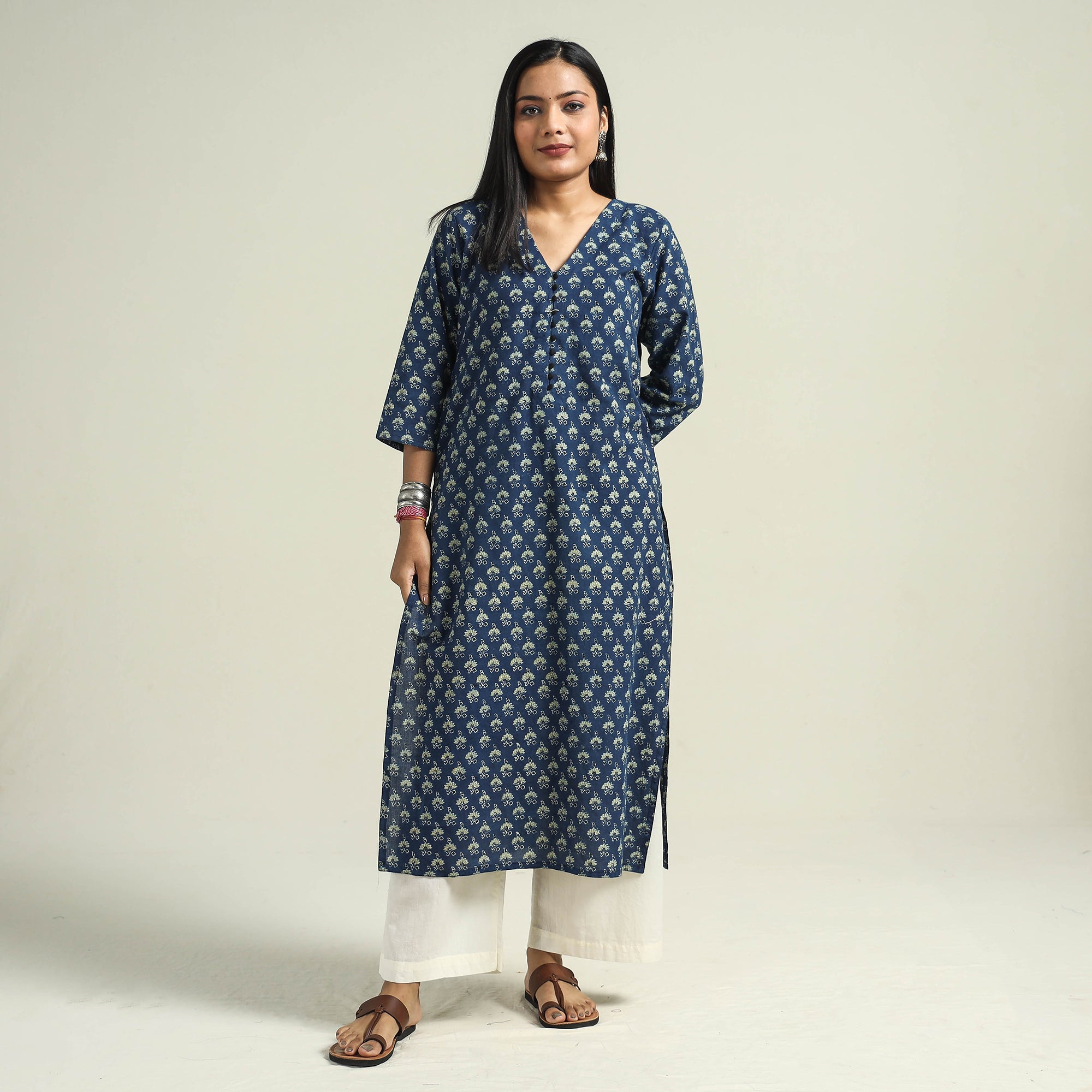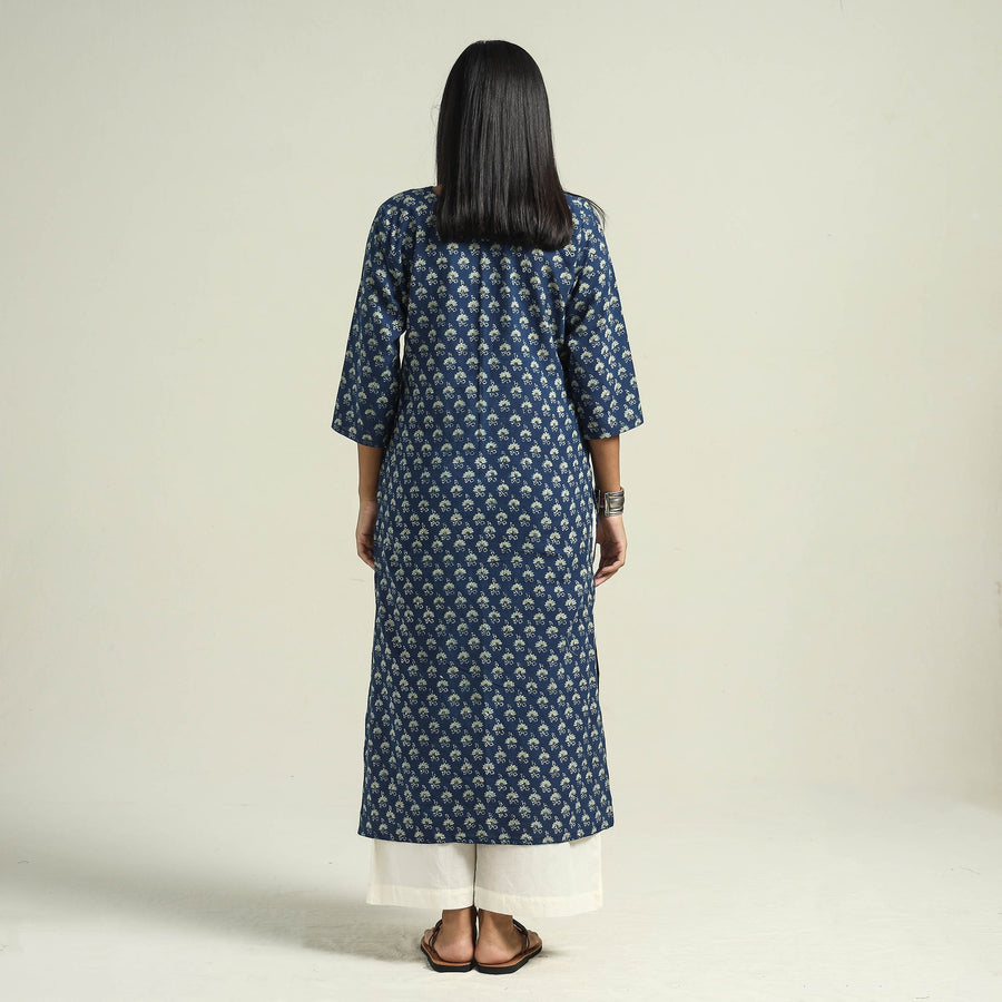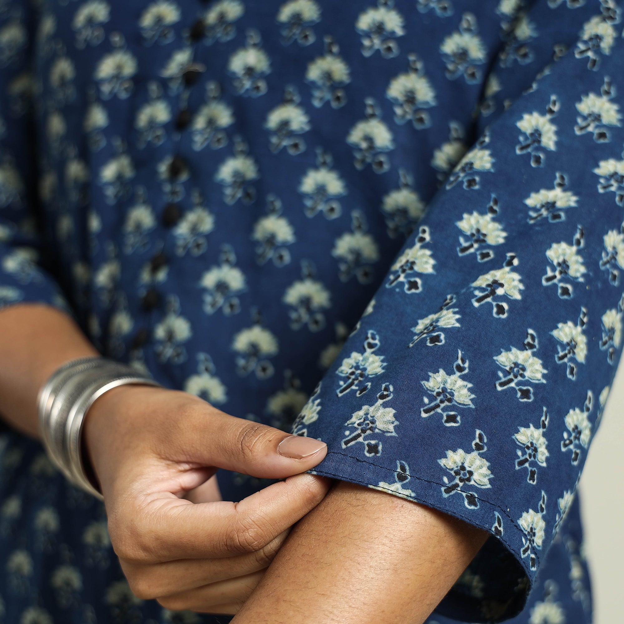 Look and feel beautiful in this uniquely designed Ajrakh hand block printed cotton long kurta. This exquisite kurta is made using naturally dyed cotton fabric through the traditional ajrakh technique of hand block printing. The kurta also features a convenient one-side pocket, perfect for carrying small essentials. This cotton kurta makes you comfortable all day long. It's an ideal choice for both casual and festive occasions.