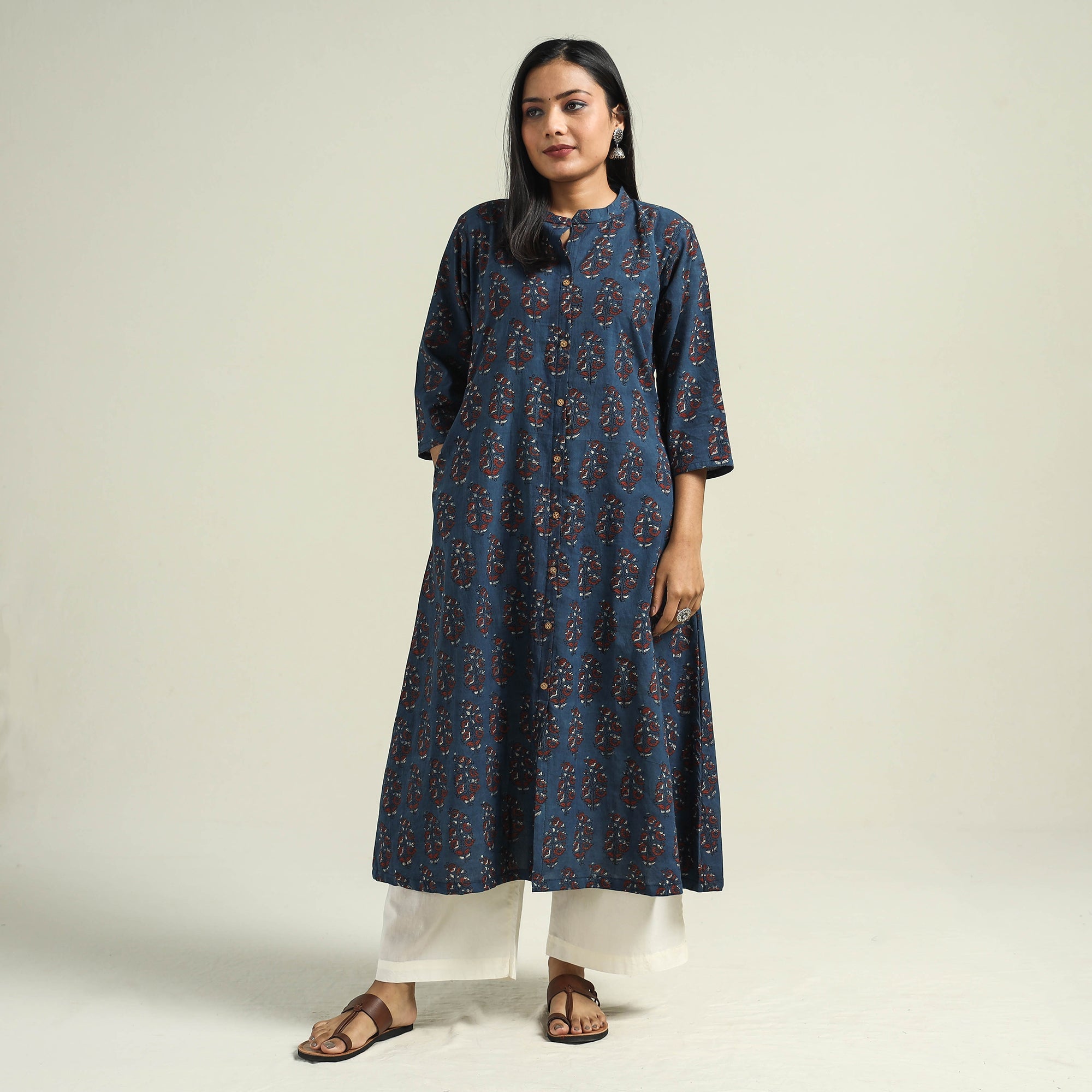 Look and feel beautiful in this uniquely designed Ajrakh hand block printed cotton long kurta. This exquisite kurta is made using naturally dyed cotton fabric through the traditional ajrakh technique of hand block printing. The kurta also features a convenient one-side pocket, perfect for carrying small essentials. This cotton kurta makes you comfortable all day long. It's an ideal choice for both casual and festive occasions.