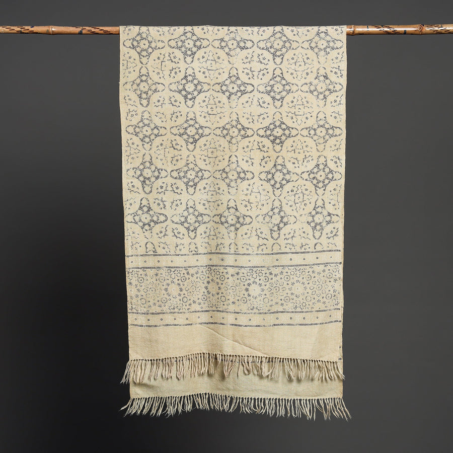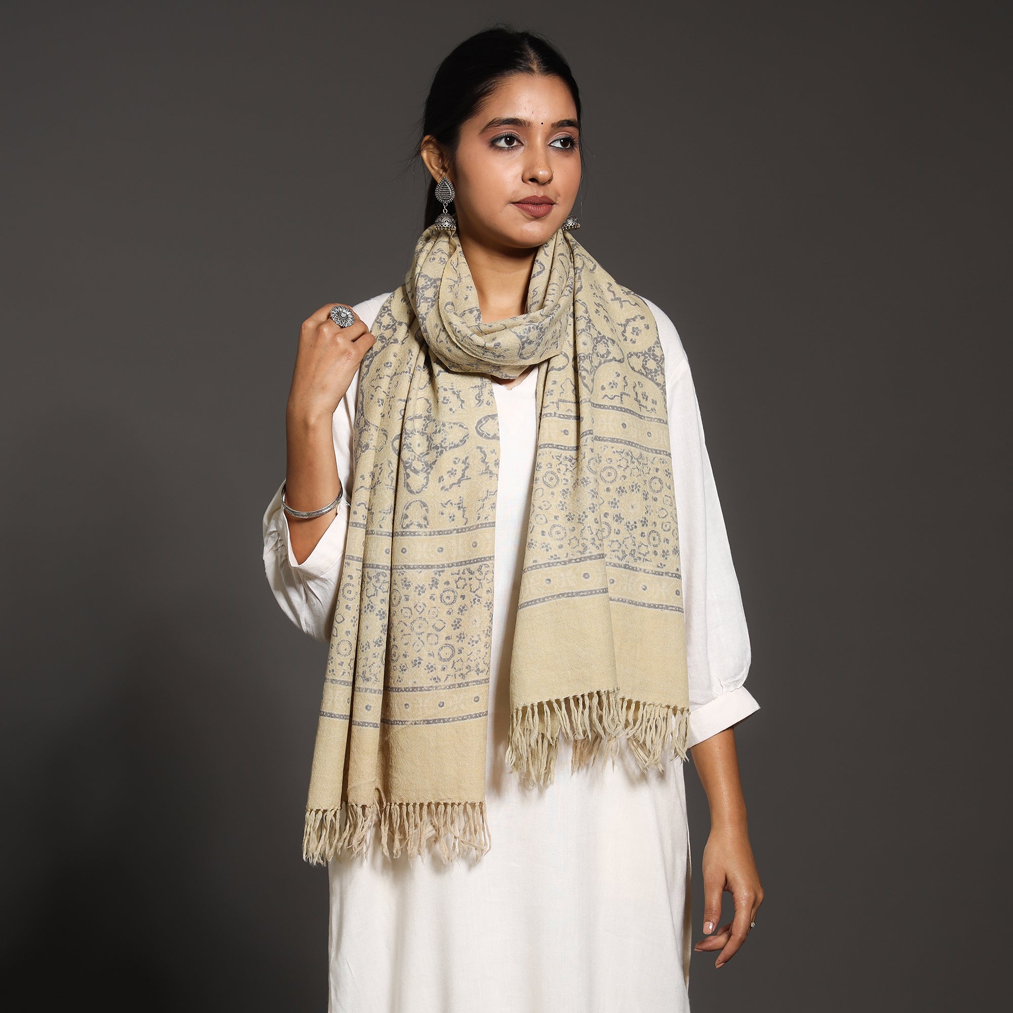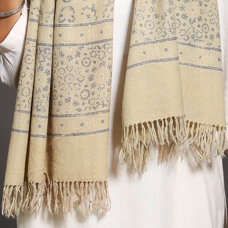 This traditional Kutch handwoven beige ajrakh hand block printed pure woolen stole, made by craftsmen and women using natural dyes through traditional ajrakh technique of hand-block printing practised by the artisans in Kutch region of Gujarat. The pure wool ensures luxurious comfort, making it a perfect accessory for any occasion. Elevate your ensemble and embrace the rich heritage and craftsmanship woven into every thread.