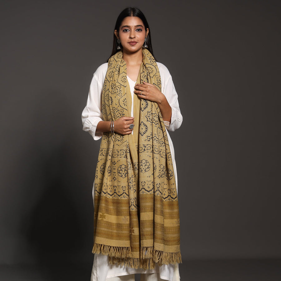 This traditional brown kutch handwoven ajrakh hand block printed pure woolen shawl, made by craftsmen and women using natural dyes through traditional ajrakh technique of hand-block printing practised by the artisans in Kutch region of Gujarat. The pure wool ensures luxurious comfort, making it a perfect accessory for any occasion. Elevate your ensemble and embrace the rich heritage and craftsmanship woven into every thread.