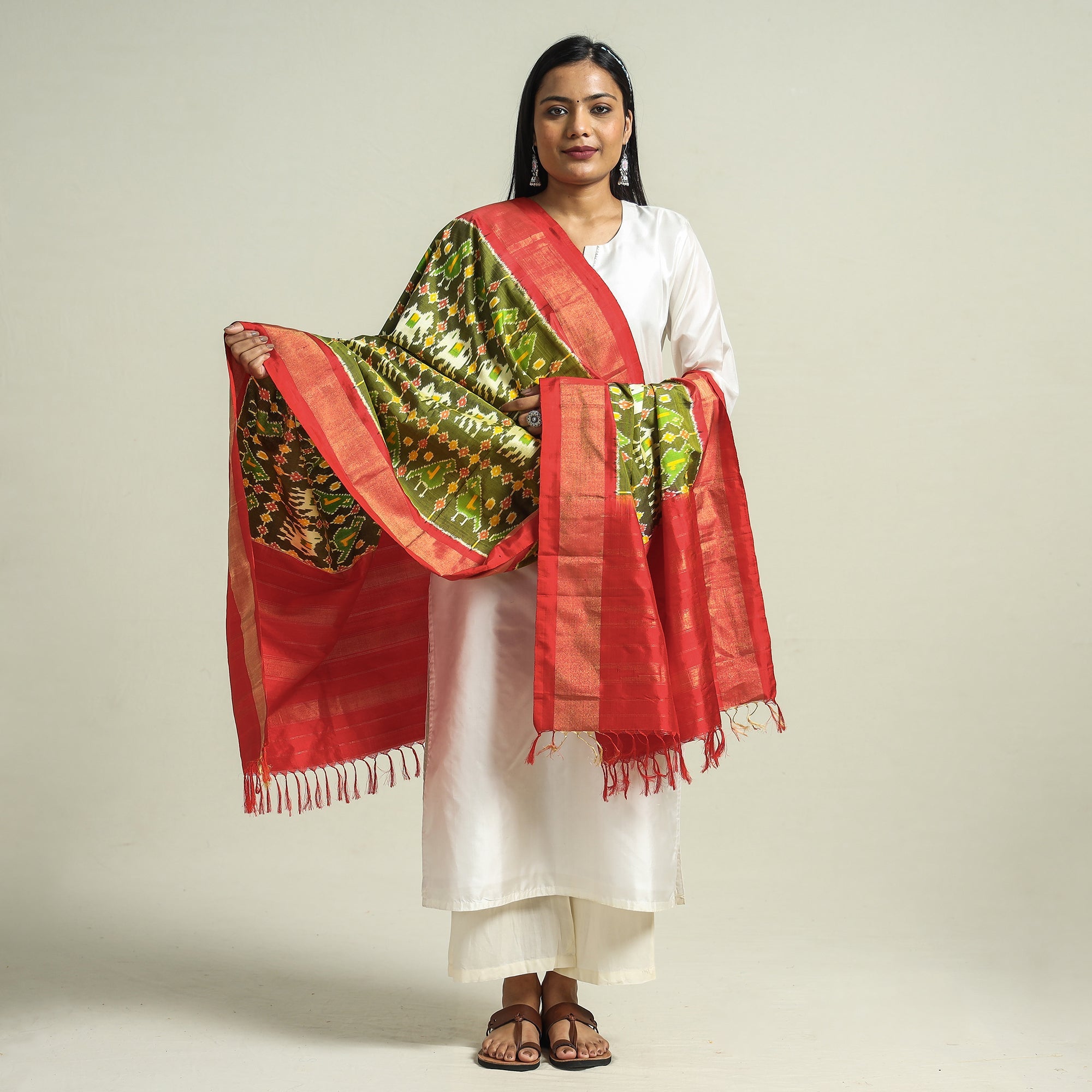 Elevate your style with our pochampally ikat pure mulberry silk handloom handwoven dupatta with zari border from telangana. Ikat (Ikkat) is a dyeing technique used to pattern textiles that employs a resist dyeing process similar to tie-dye on either the warp or weft fibers prior to dyeing. Ikat has lovely patterns and are world famous for their extremely beautiful colors, texture and designs. Indian Ikat is always admired by the fashion designers around the world. Mulberry silk known for its shine and softness. It is one of the most renowned and popular forms of silk. Adorned with chic tassels, it effortlessly enhances both casual and formal ensembles, adding a touch of cultural charm and elegance to your wardrobe.