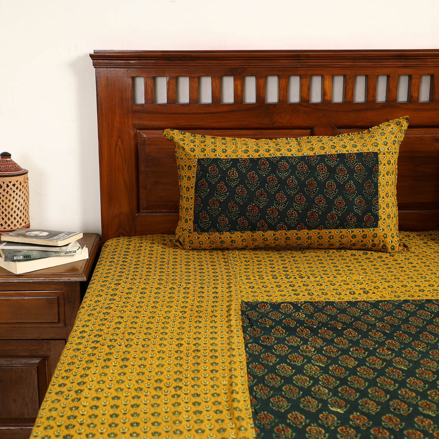 This exquisite ajrakh block Printed patchwork cotton bed cover accompanied by matching pillow covers. This bed cover features the traditional art of ajrakh block printing, showcasing intricate patterns and vibrant colors. The patchwork design adds an extra layer of artistry, making it a unique and elegant addition to your home. Crafted from high-quality cotton, it offers comfort and style. Add a touch of traditional Indian craftsmanship to your bedroom with this beautiful bed cover and pillow cover set.