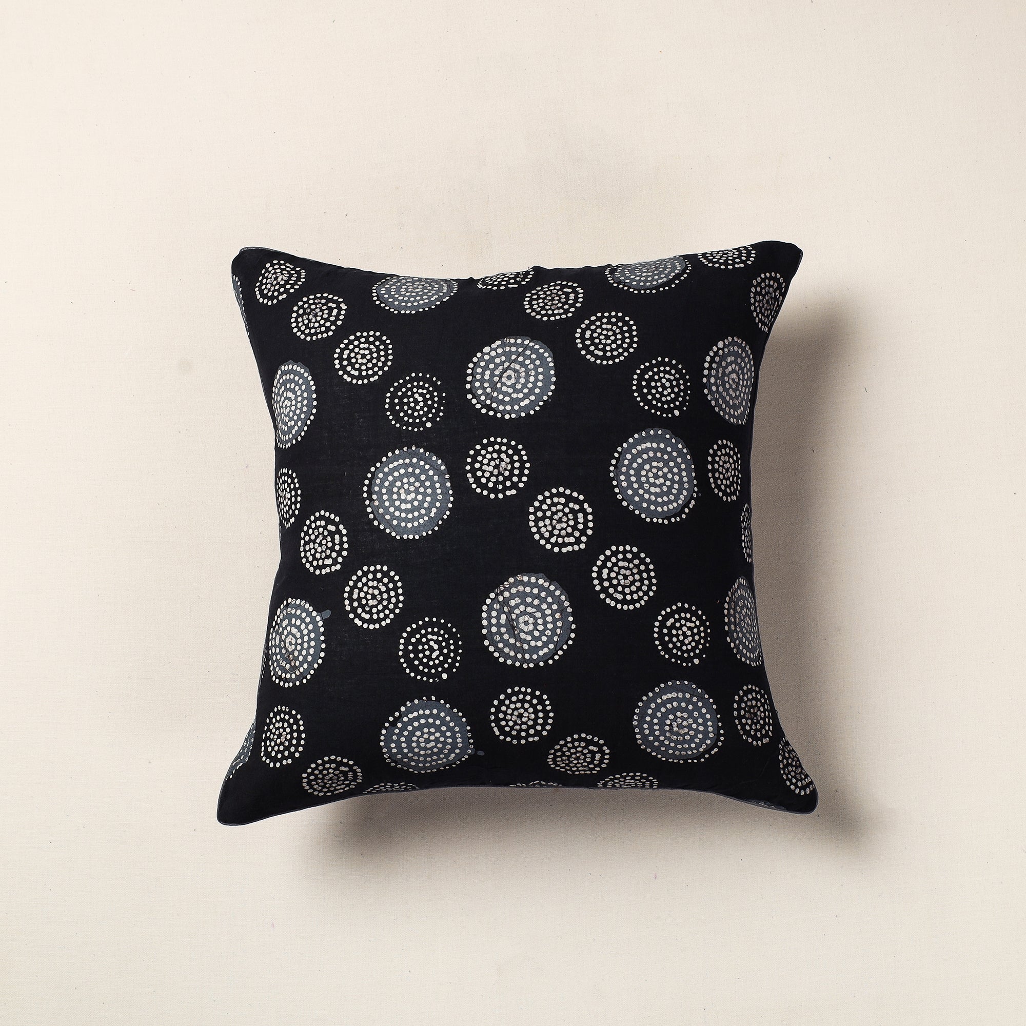 Fine quality black hand batik printed cotton cushion cover. Batik is a technique of wax-resist dyeing applied to whole cloth, or cloth made using this technique. The traditional designs and motifs in Indian batik are often passed down from one generation to another.