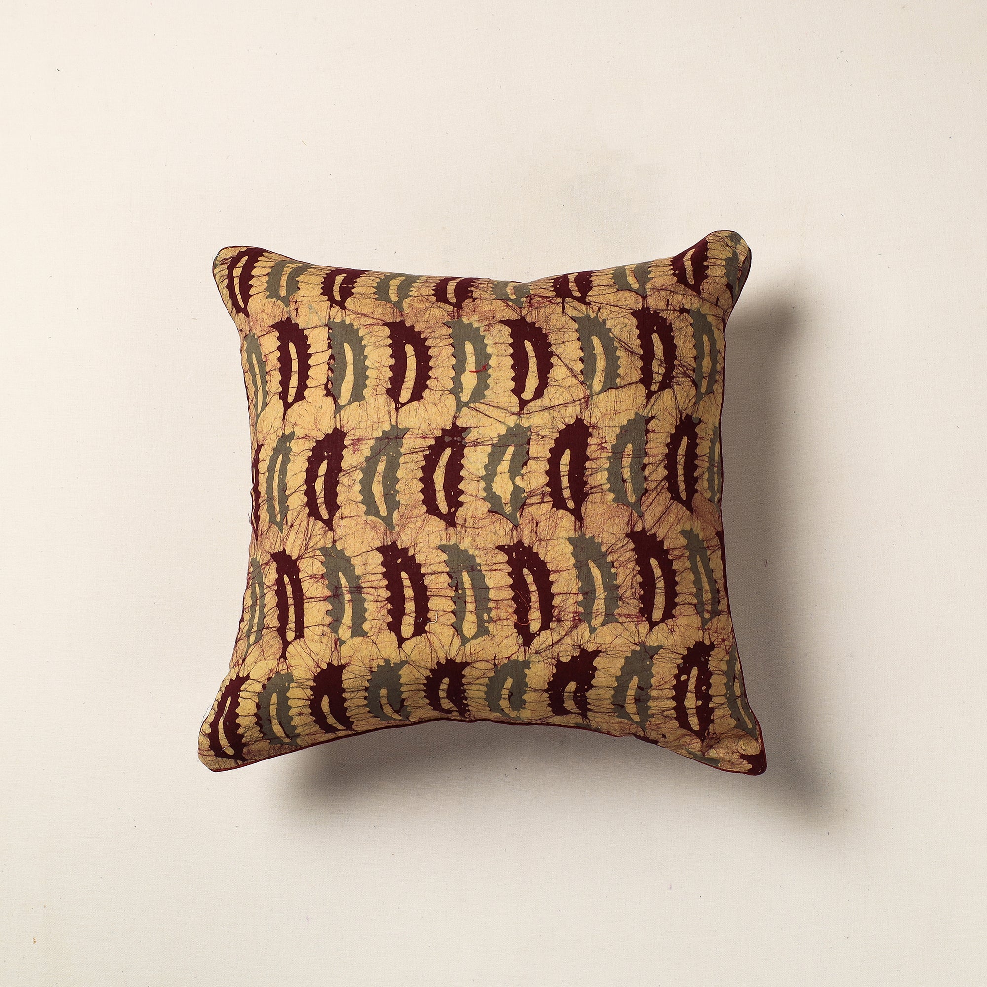 Fine quality yellow hand batik printed cotton cushion cover. Batik is a technique of wax-resist dyeing applied to whole cloth, or cloth made using this technique. The traditional designs and motifs in Indian batik are often passed down from one generation to another.