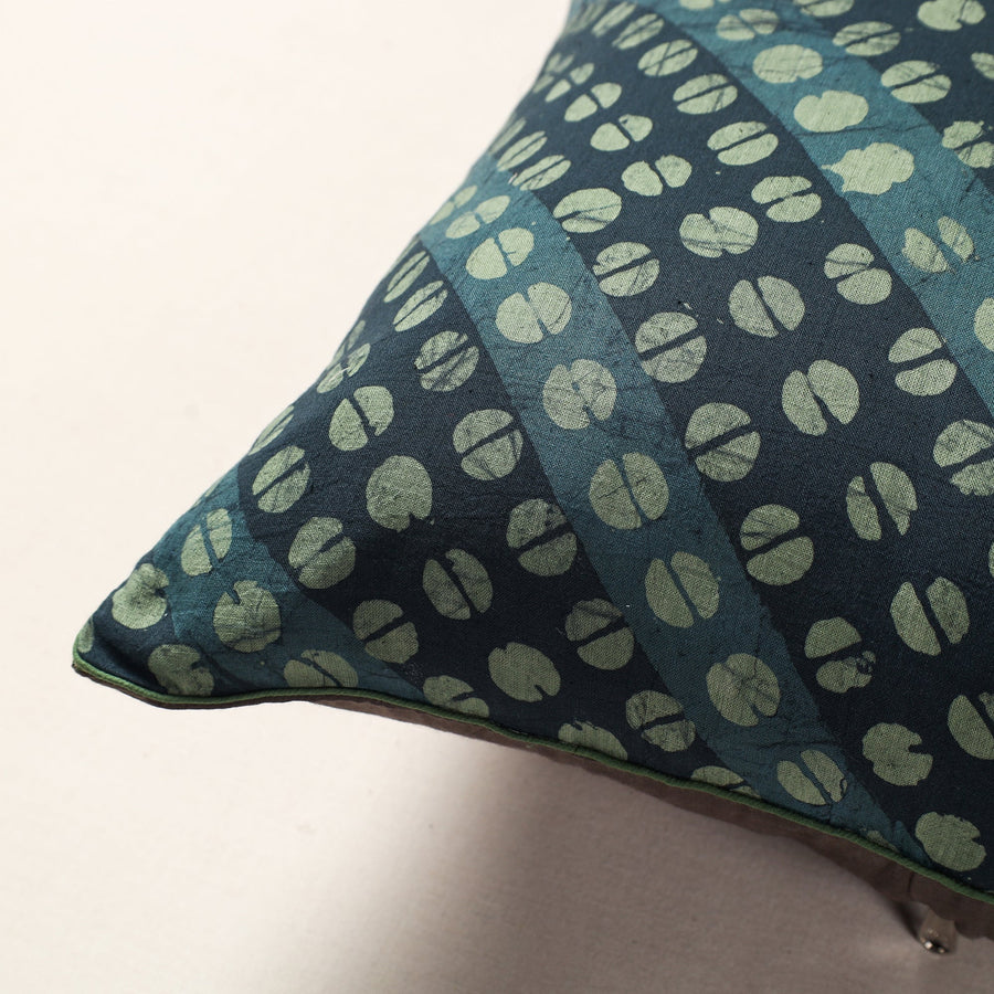 Fine quality green hand batik printed cotton cushion cover. Batik is a technique of wax-resist dyeing applied to whole cloth, or cloth made using this technique. The traditional designs and motifs in Indian batik are often passed down from one generation to another.