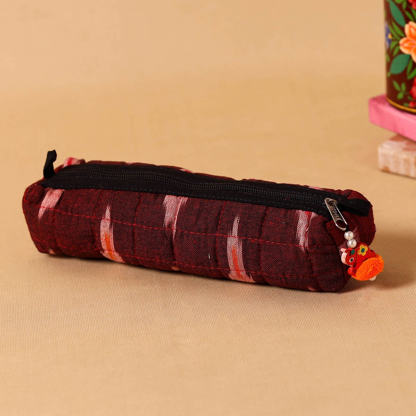 Experience the perfect blend of artistry and utility with our handcrafted maroon quilted multipurpose pencil pouch. This pouch is made from pochampally ikat weave cotton fabric with quilted filling, it exudes elegance. Features include a spacious interior for various items. Versatile and charming, it effortlessly complements your style. Embrace organization with flair!