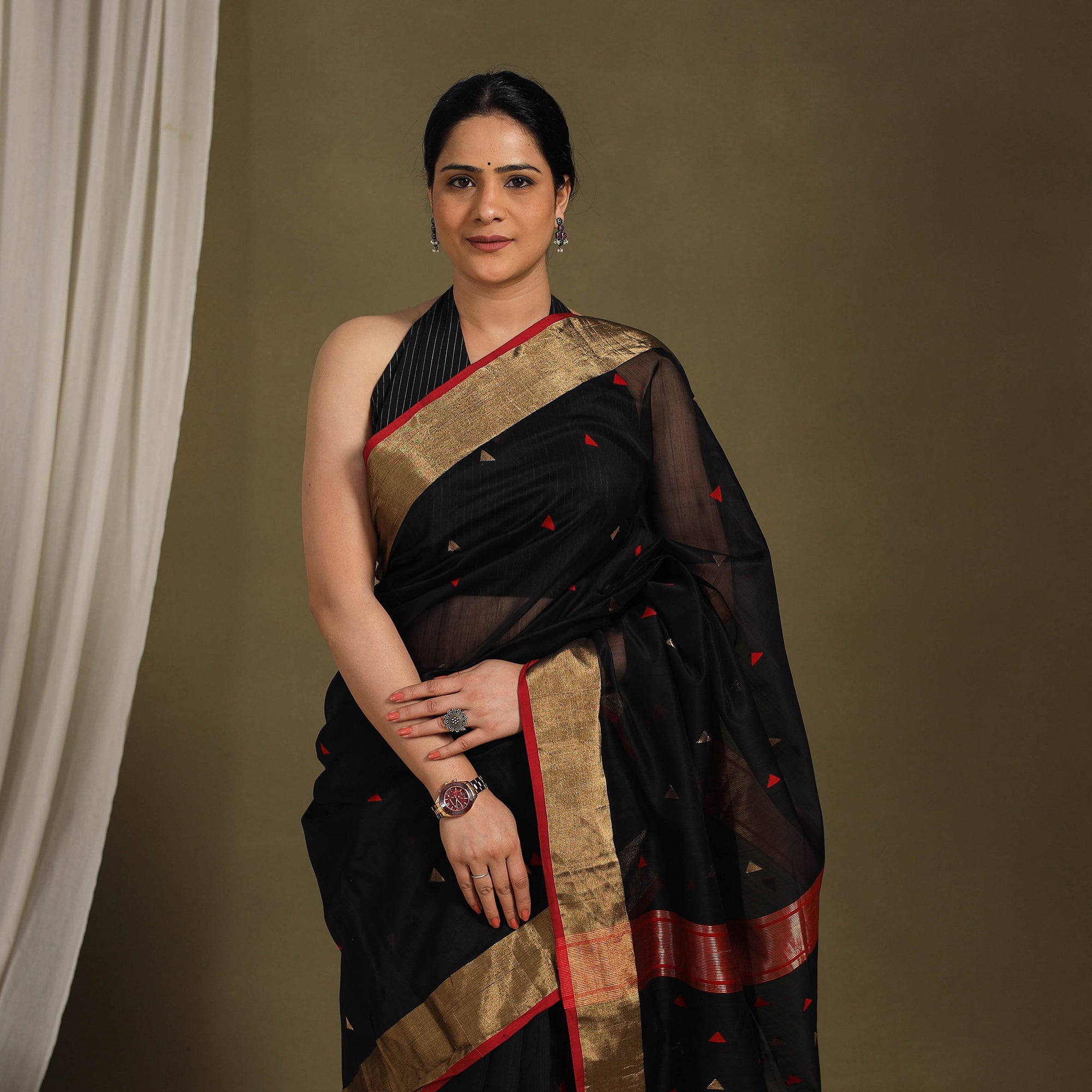 This exquisite traditional black maheshwari silk handloom triangle buti saree with zari border is skillfully handwoven in Maheshwar, a heritage town in India, using traditional techniques. The traditional handloom weaving techniques passed down through generations of skilled artisans in Maheshwar. This lightweight, sheer saree is perfect for special occasions, adding a touch of grace and sophistication to your attire. Elevate your style with this exquisite piece of artistry.