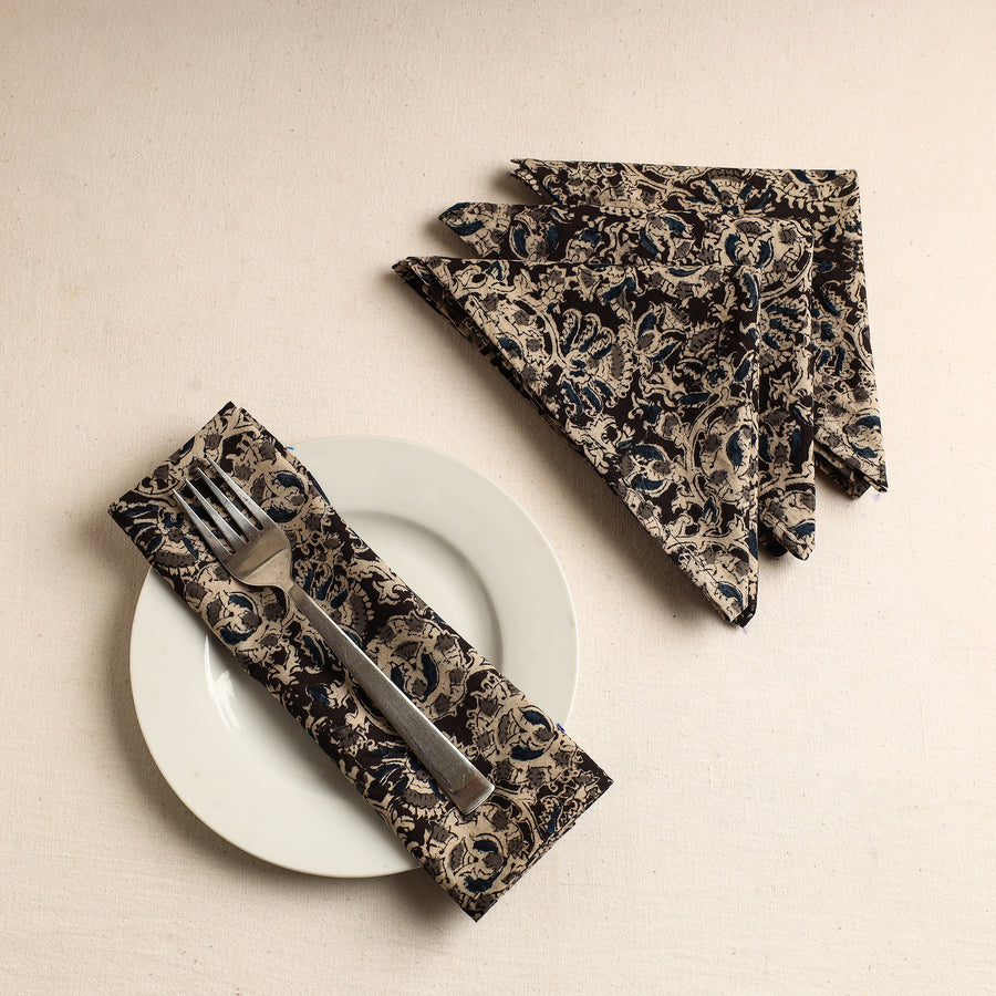 Elevate your dining experience with our black kalamkari block printed cotton table napkins. Crafted with intricate designs and vibrant colors, these napkins add a touch of traditional charm to any table setting. Perfect for both casual and formal occasions, they effortlessly combine style and functionality, making every meal a delightful affair.