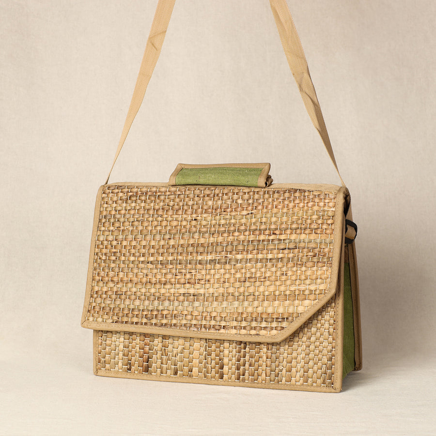 Elevate your conference experience with our beige handcrafted organic water hyacinth conference bag. Carefully woven by skilled artisans in Assam, this unique accessory boasts intricate patterns derived from naturally dried water hyacinth reed fibers. The bag features one zipper and one open pocket inside, providing ample space for your essentials. The adjustable strap ensures comfort, making it an ideal companion for conferences, meetings, or any professional gathering. Make a statement with this sustainable and stylish bag, embodying the essence of craftsmanship and eco-conscious elegance.