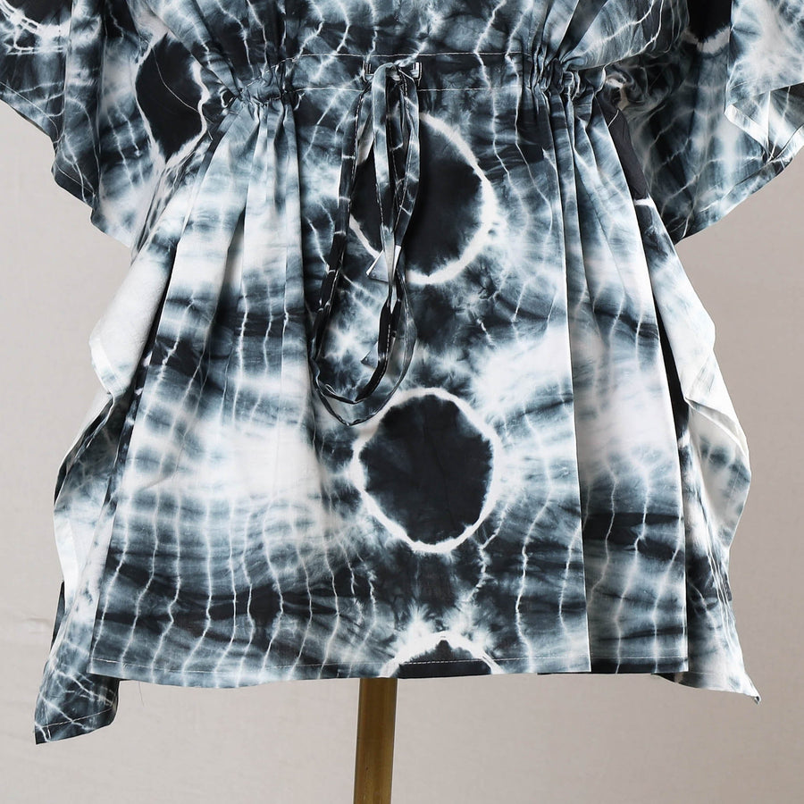 Fine quality shibori tie-dye cotton kaftan. A traditional kaftan or caftan is an short-length garment with long, flowing sleeves. It has an adjustable drawstring waist. These loose-fitting cotton kaftans are enhanced by hand dyed using shibori tie and dye technique in which the fabric is tied using clamp or stitches in the required design and the pattern is dyed. This dress will allow you to move with ease and comfort. The drawstring waist tie will give you the freedom to customize the fit to suit your unique shape.