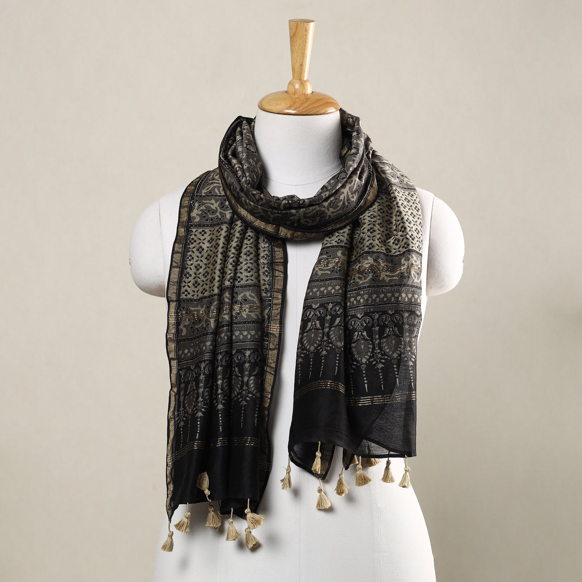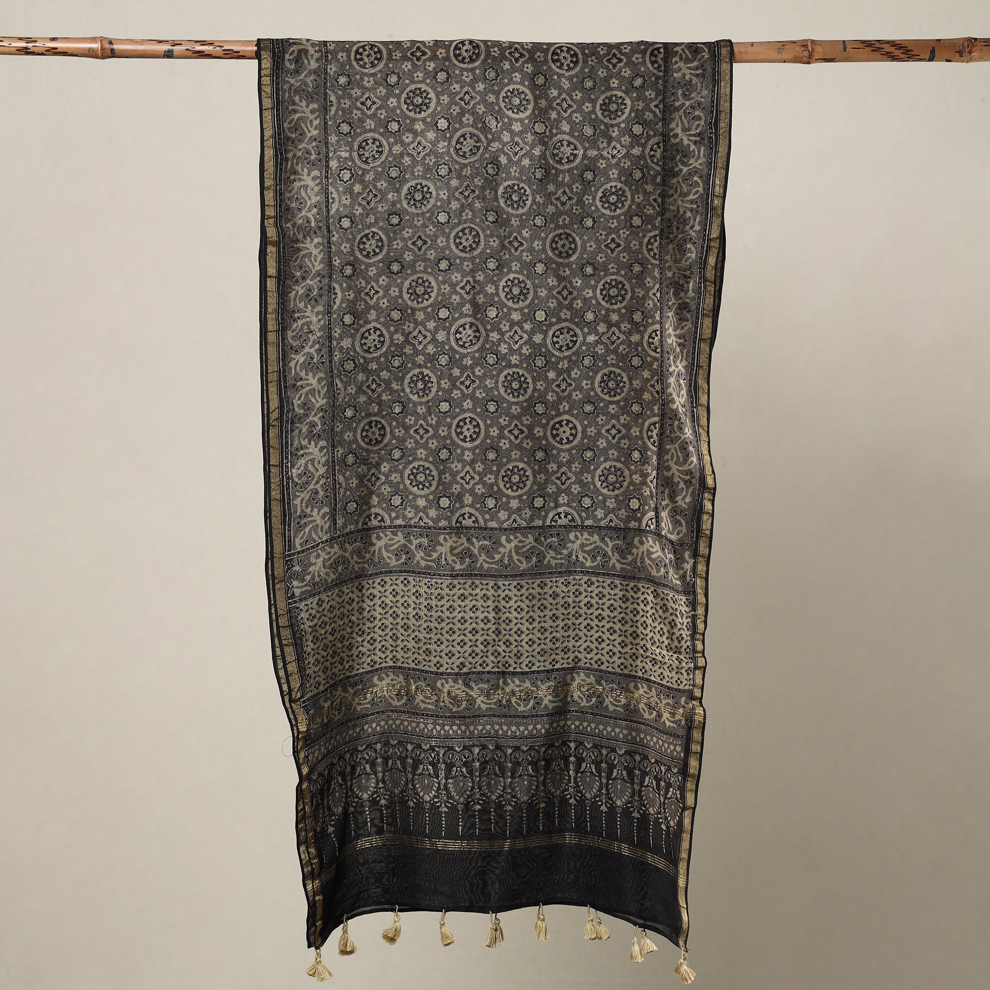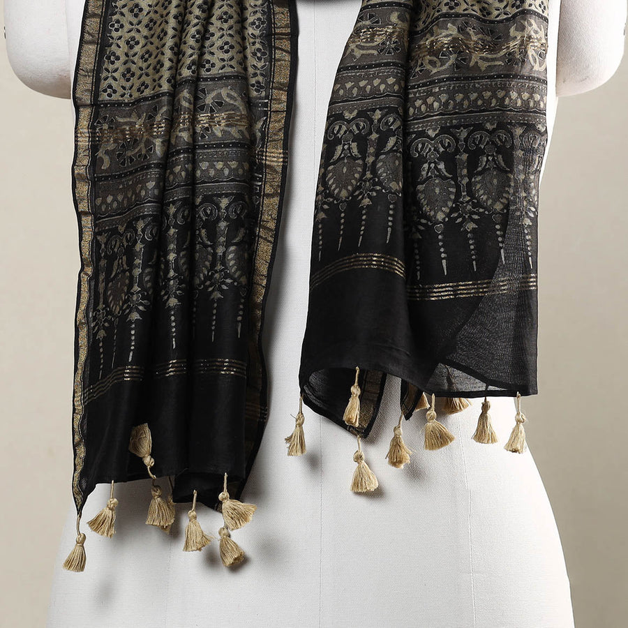 | Material | Elevate your style with this fine quality grey ajrakh hand block printed chanderi silk-cotton handloom stole with tassels. This exquisite stole is made using natural dyes through the traditional techniques of hand block printing by the master artisan of Sufiyan Ismail Khatri, from the Kutch region of Gujarat. This exquisite stole can elevate any outfit. It's versatile and suitable for both formal and casual occasions, adding a touch of traditional Indian artistry to your style. |