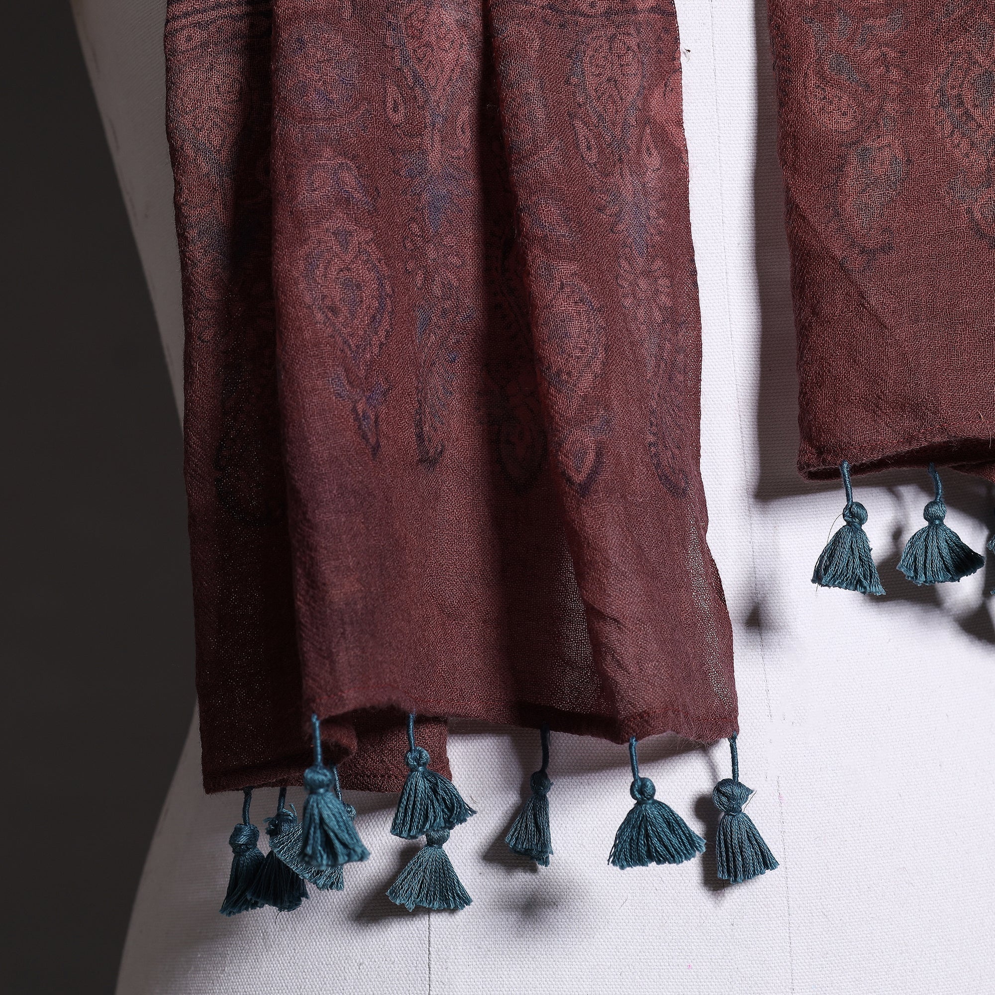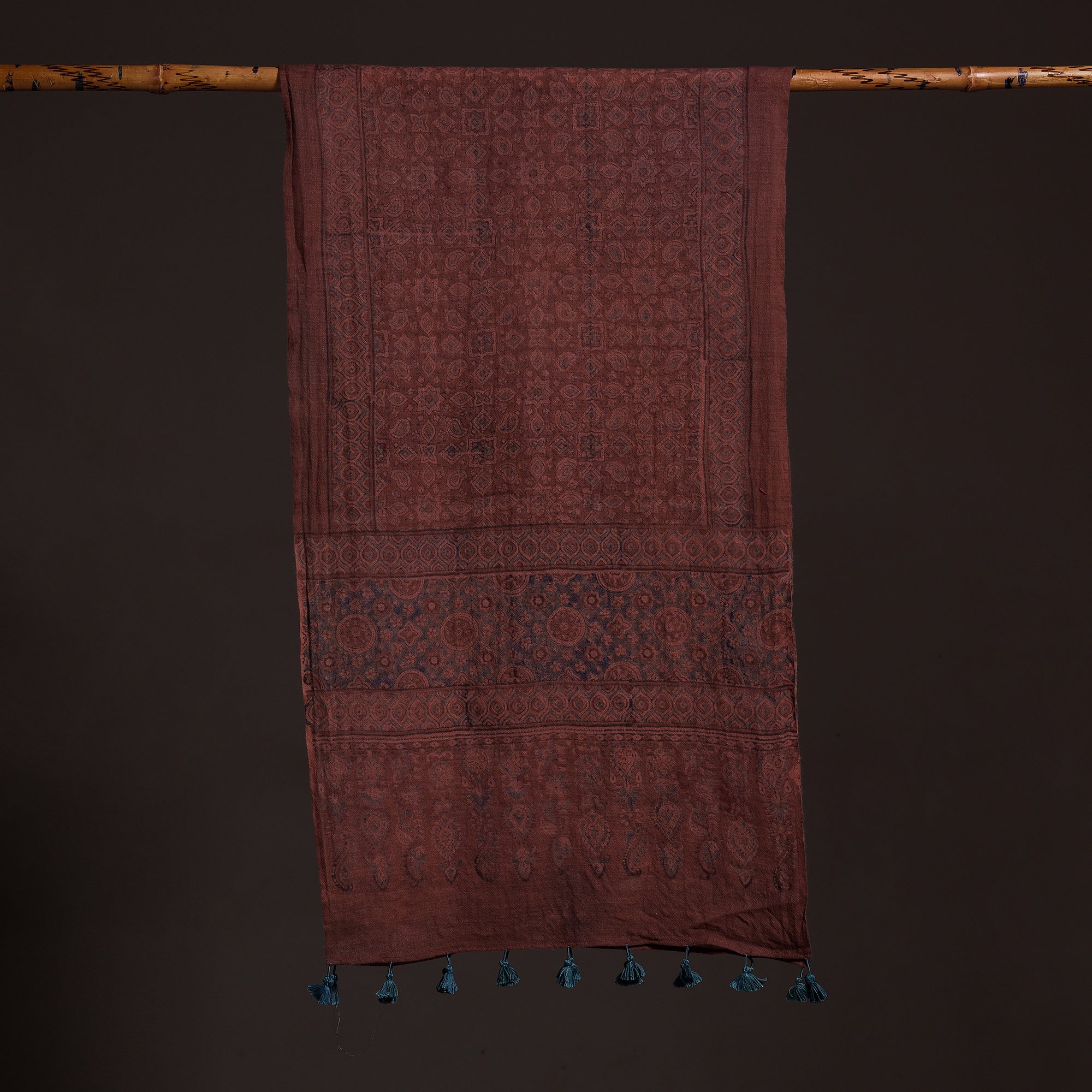 Elevate your style with this fine quality maroon ajrakh hand block-printed pure wool stole. This exquisite stole is made using natural dyes through the traditional techniques of hand block printing by the master artisan of Sufiyan, Ismail Khatri, from the Kutch region of Gujarat. The pure wool construction offers exceptional warmth and softness, making it perfect for cold weather. This exquisite stole can elevate any outfit. It's versatile and suitable for both formal and casual occasions, adding a touch of traditional Indian artistry to your style.