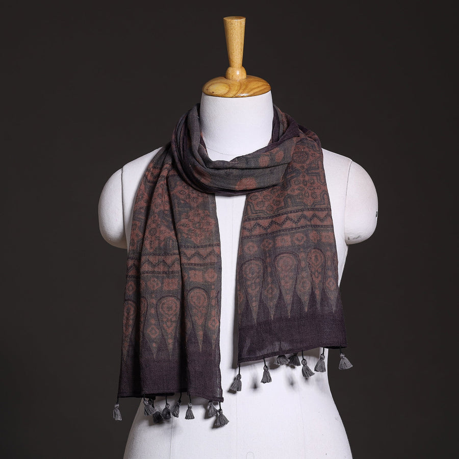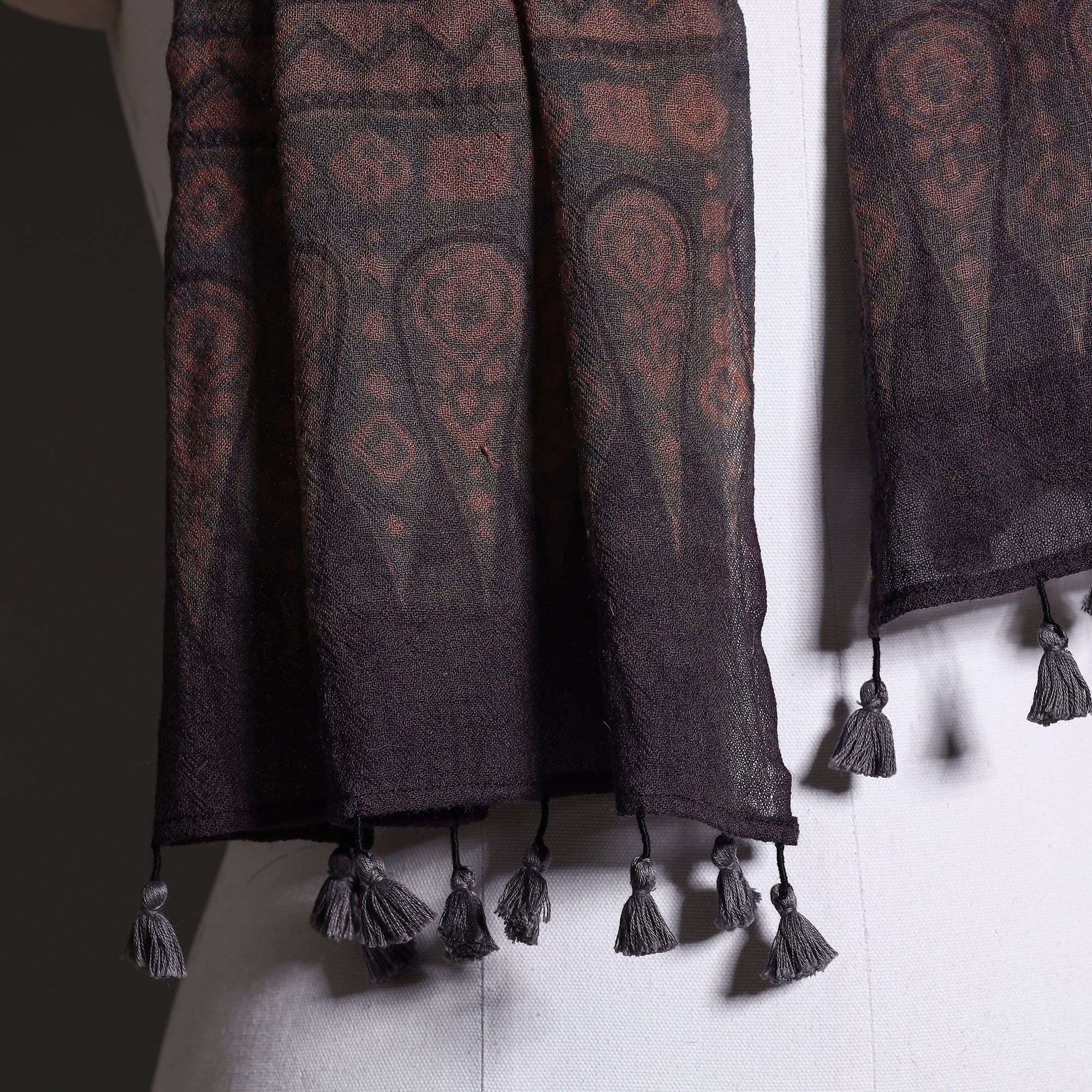 Elevate your style with this fine quality brown ajrakh hand block-printed pure wool stole. This exquisite stole is made using natural dyes through the traditional techniques of hand block printing by the master artisan of Sufiyan, Ismail Khatri, from the Kutch region of Gujarat. The pure wool construction offers exceptional warmth and softness, making it perfect for cold weather. This exquisite stole can elevate any outfit. It's versatile and suitable for both formal and casual occasions, adding a touch of traditional Indian artistry to your style.
