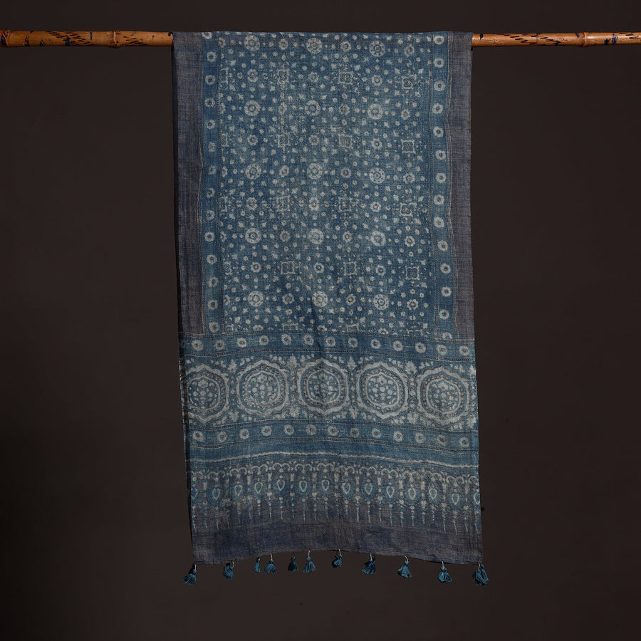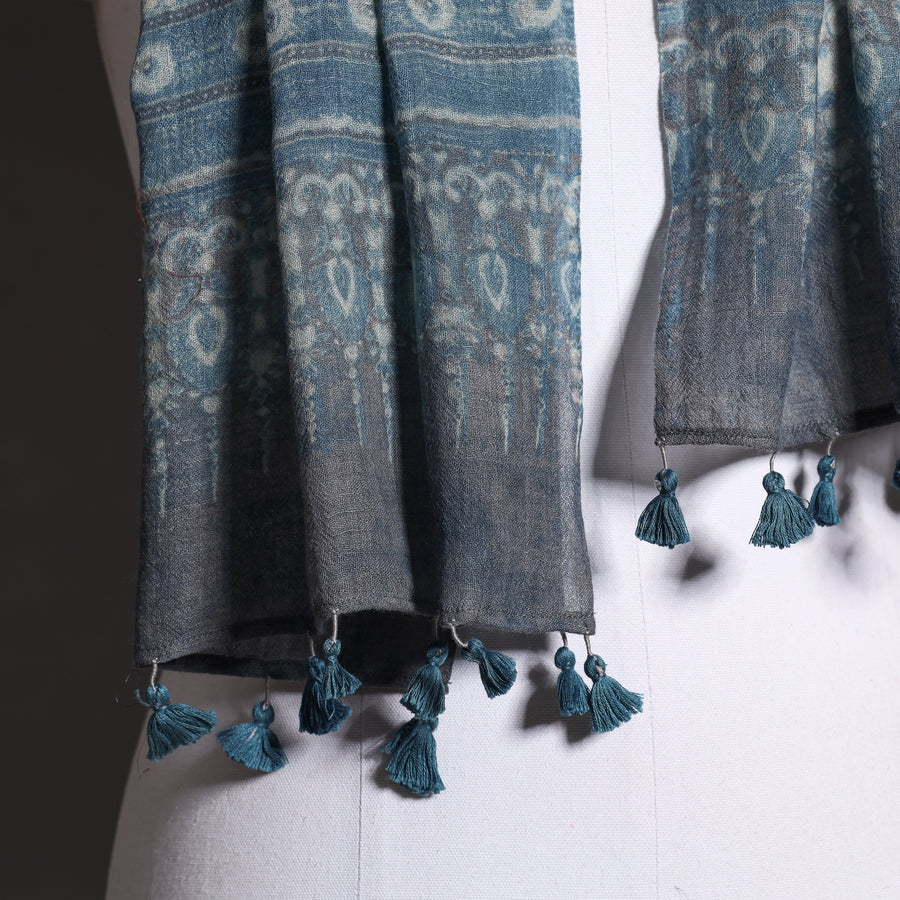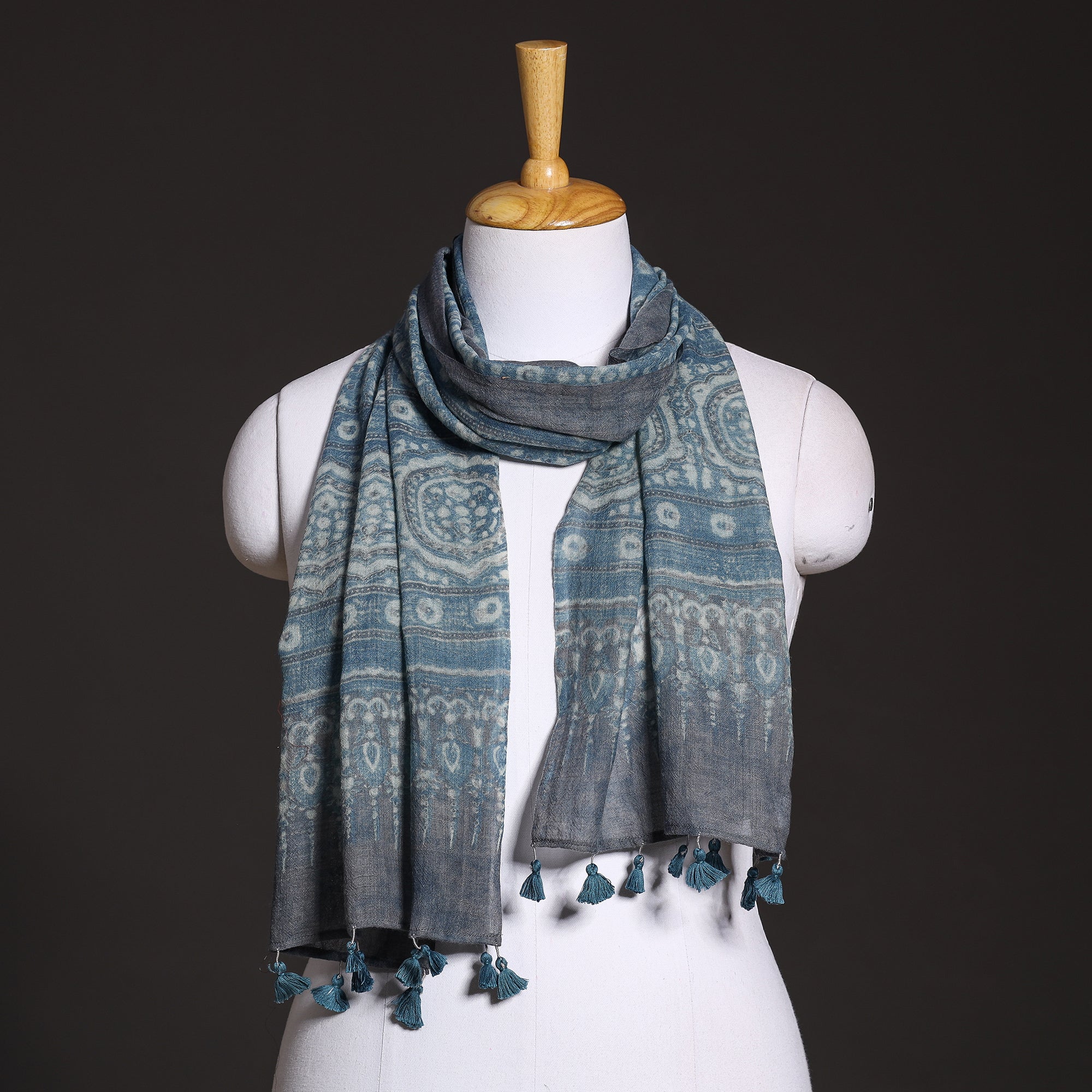 Elevate your style with this fine quality blue ajrakh hand block-printed pure wool stole. This exquisite stole is made using natural dyes through the traditional techniques of hand block printing by the master artisan of Sufiyan, Ismail Khatri, from the Kutch region of Gujarat. The pure wool construction offers exceptional warmth and softness, making it perfect for cold weather. This exquisite stole can elevate any outfit. It's versatile and suitable for both formal and casual occasions, adding a touch of traditional Indian artistry to your style.