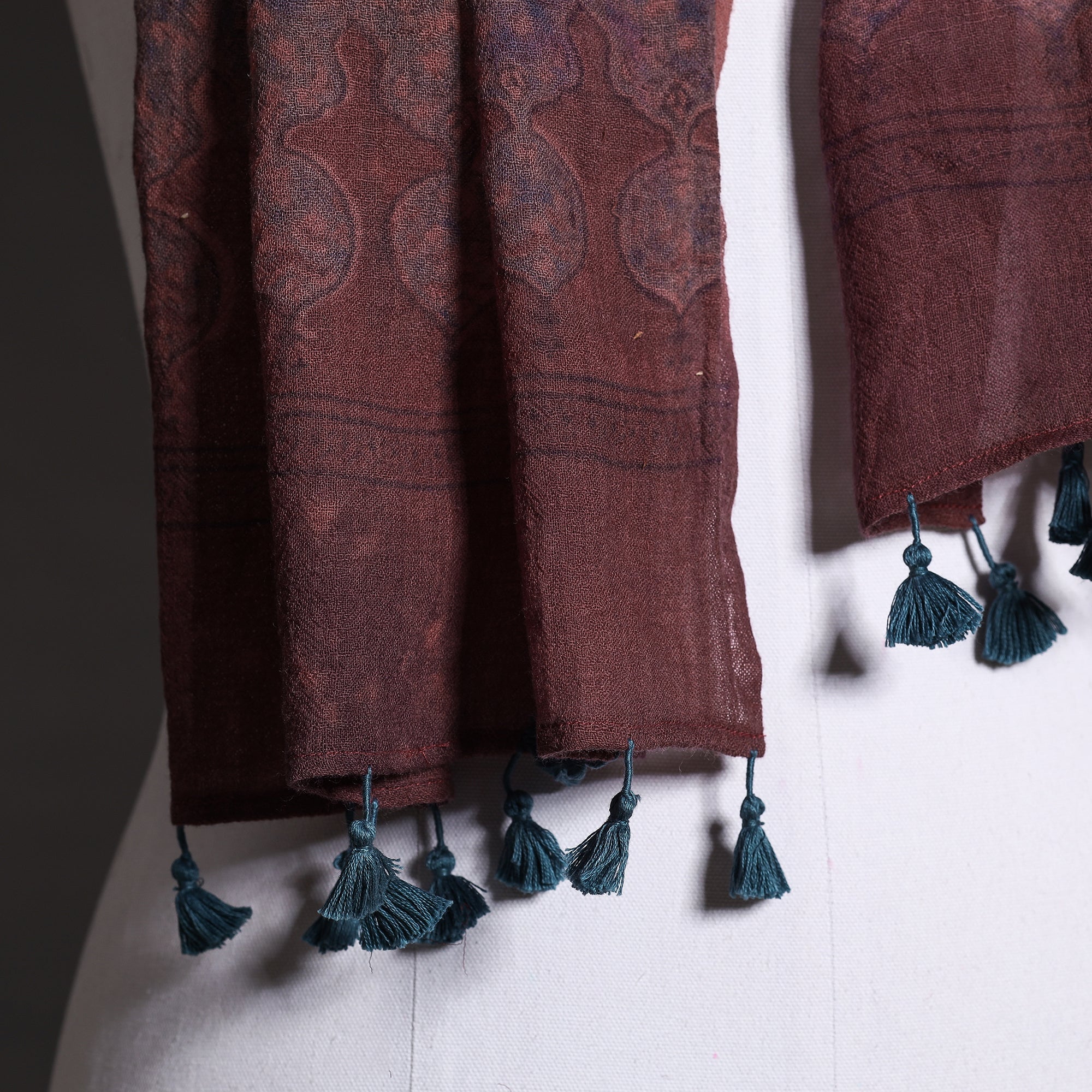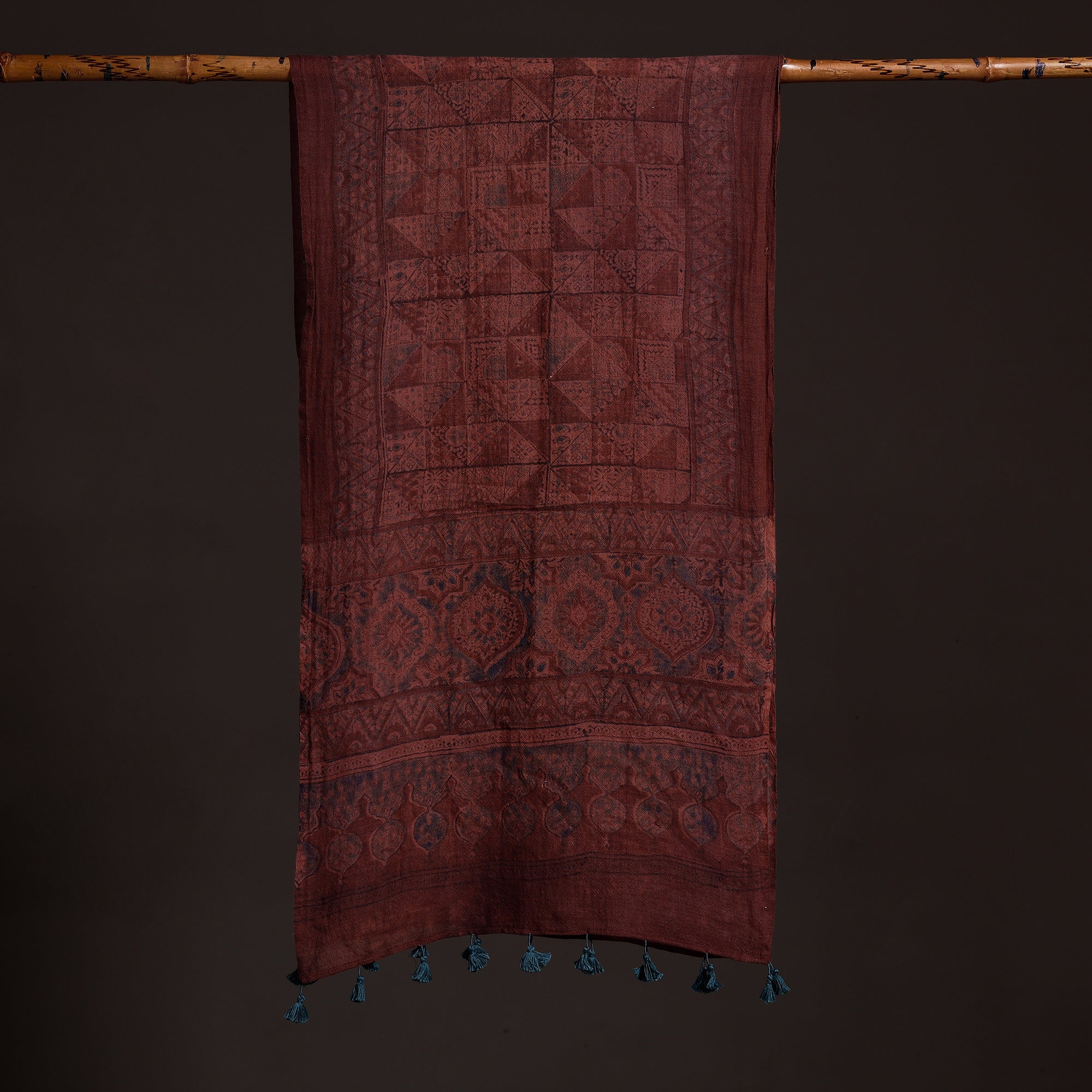 Elevate your style with this fine quality maroon ajrakh hand block-printed pure wool stole. This exquisite stole is made using natural dyes through the traditional techniques of hand block printing by the master artisan of Sufiyan, Ismail Khatri, from the Kutch region of Gujarat. The pure wool construction offers exceptional warmth and softness, making it perfect for cold weather. This exquisite stole can elevate any outfit. It's versatile and suitable for both formal and casual occasions, adding a touch of traditional Indian artistry to your style.