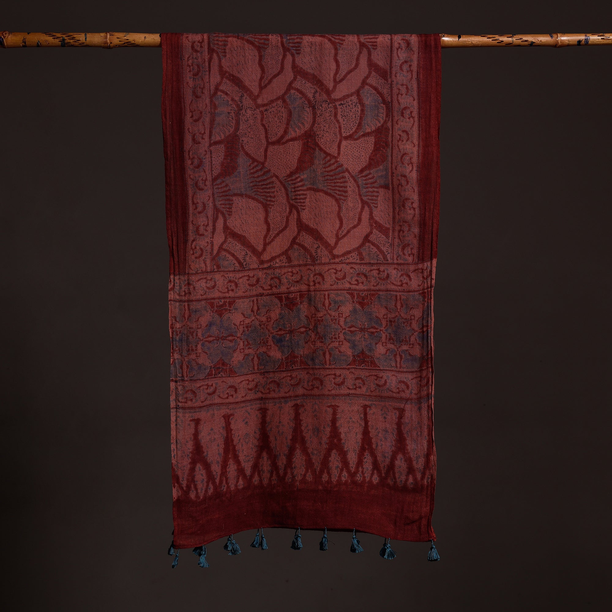 Elevate your style with this fine quality maroon ajrakh hand block-printed pure wool stole. This exquisite stole is made using natural dyes through the traditional techniques of hand block printing by the master artisan of Sufiyan, Ismail Khatri, from the Kutch region of Gujarat. The pure wool construction offers exceptional warmth and softness, making it perfect for cold weather. This exquisite stole can elevate any outfit. It's versatile and suitable for both formal and casual occasions, adding a touch of traditional Indian artistry to your style.