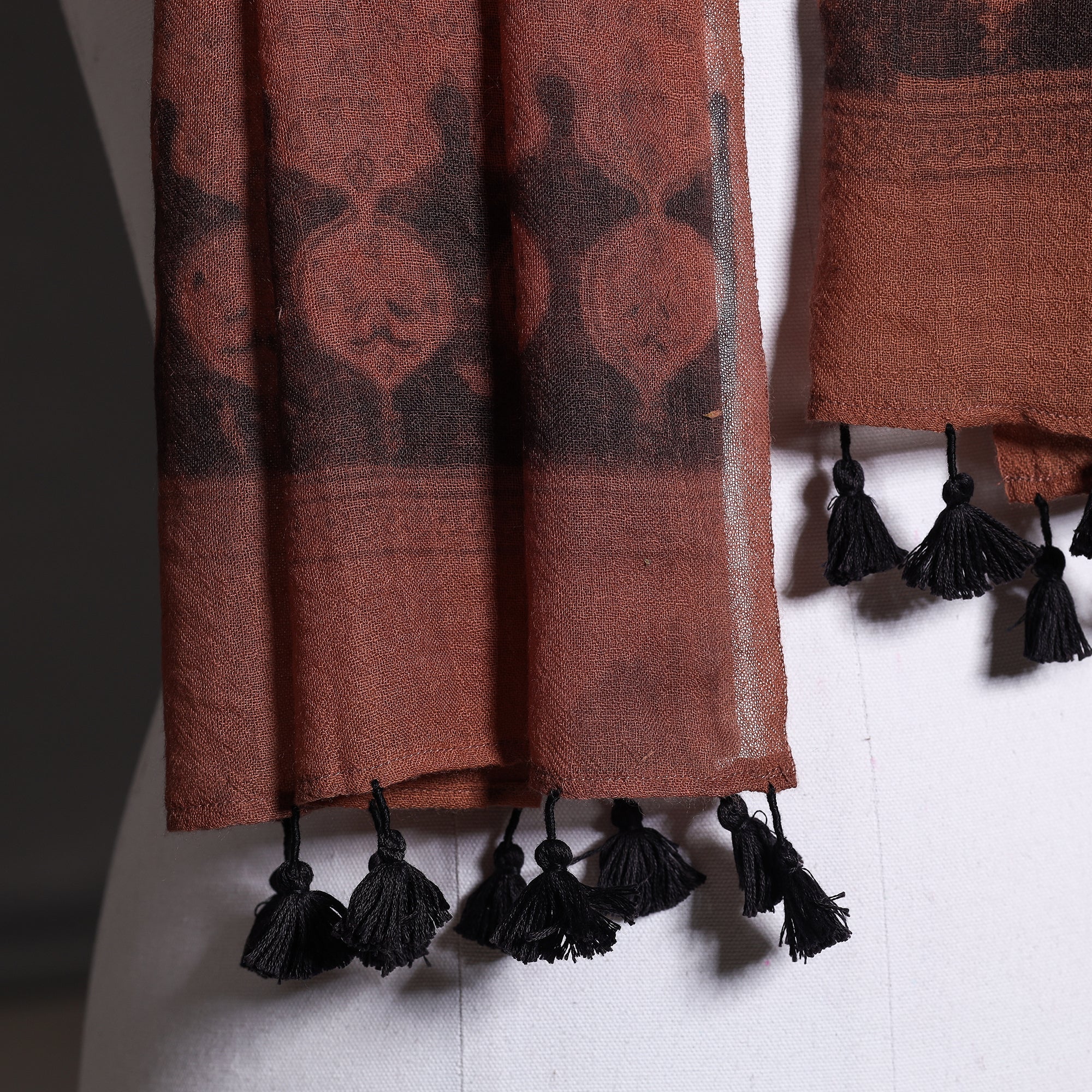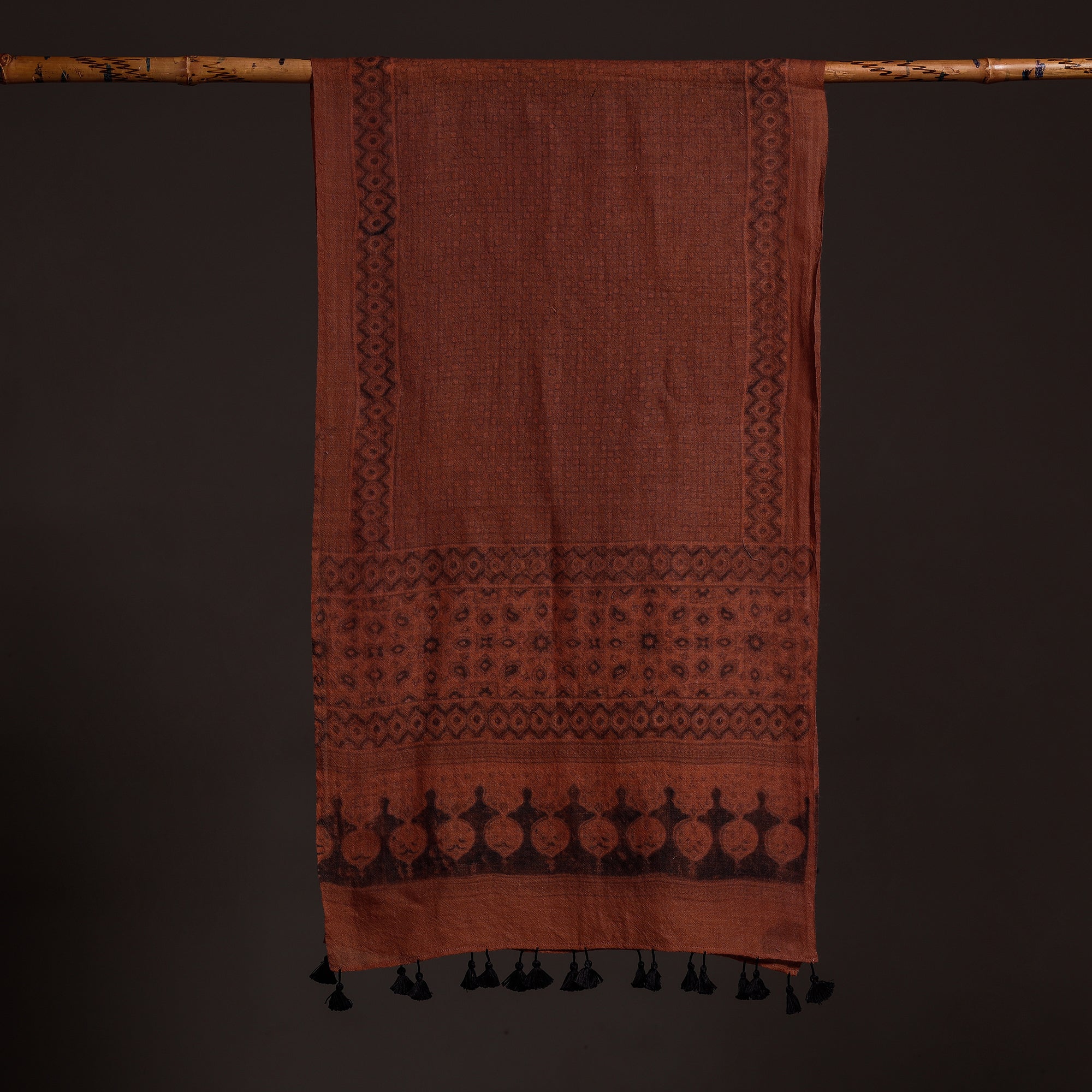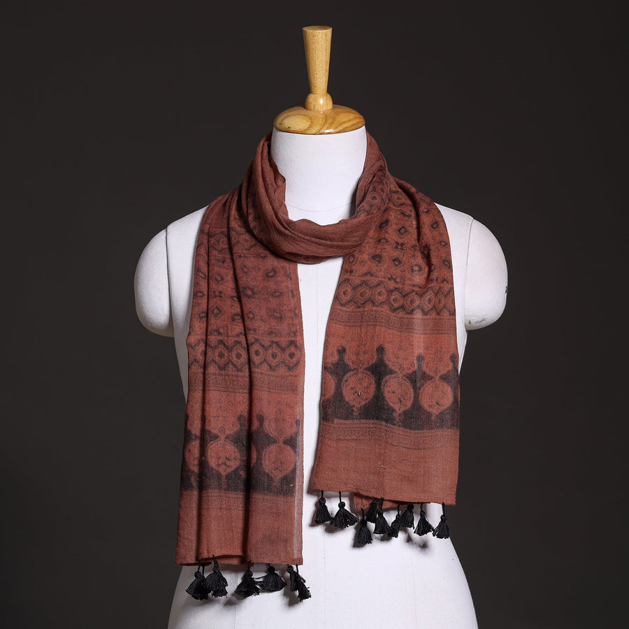 Elevate your style with this fine quality brown ajrakh hand block-printed pure wool stole. This exquisite stole is made using natural dyes through the traditional techniques of hand block printing by the master artisan of Sufiyan, Ismail Khatri, from the Kutch region of Gujarat. The pure wool construction offers exceptional warmth and softness, making it perfect for cold weather. This exquisite stole can elevate any outfit. It's versatile and suitable for both formal and casual occasions, adding a touch of traditional Indian artistry to your style.