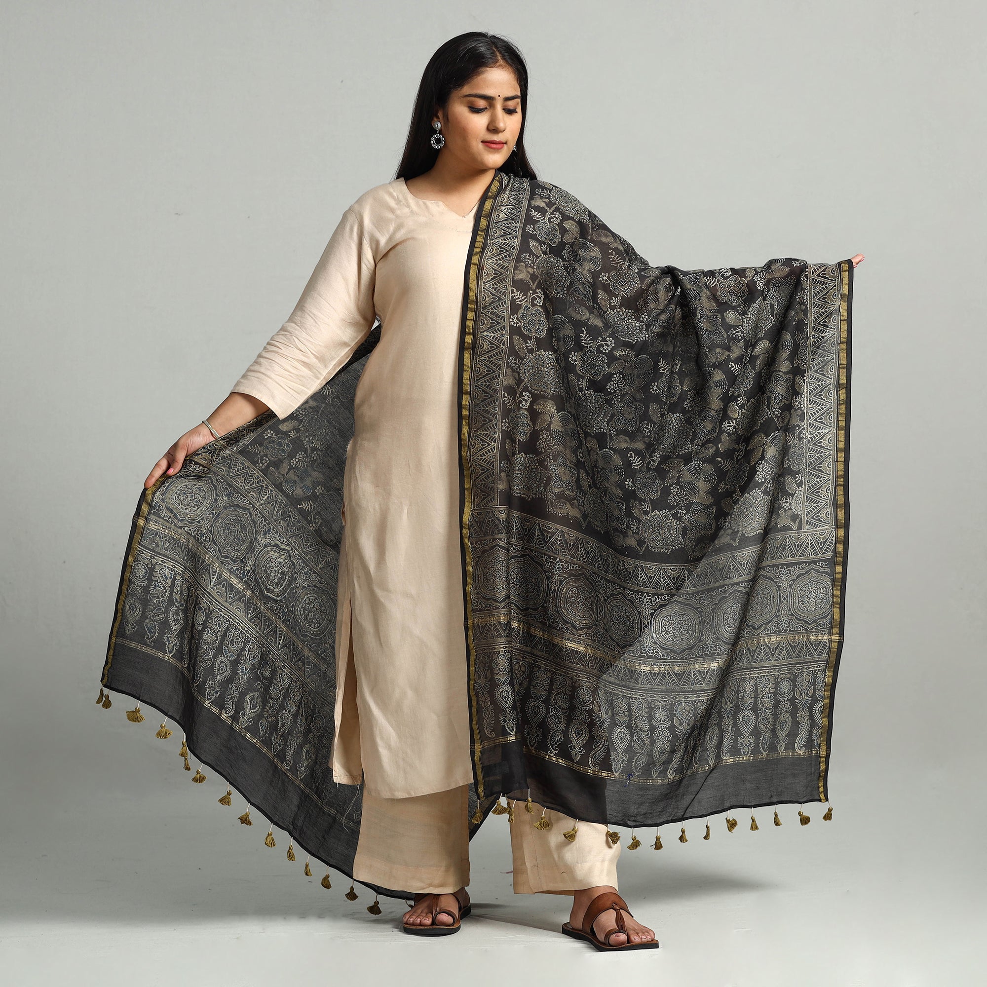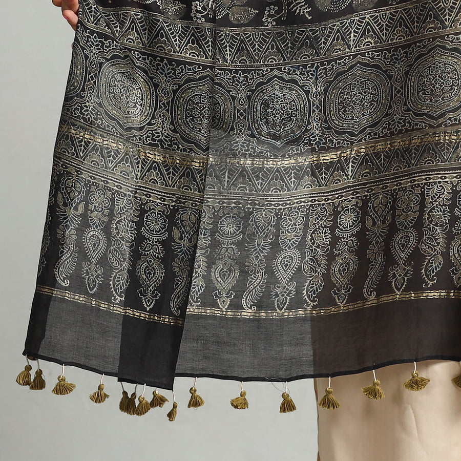 Elevate your style with this fine quality black ajrakh hand block printed chanderi silk-cotton handloom dupatta with tassels. This exquisite dupatta is made using natural dyes through the traditional techniques of hand block printing by the master artisan of Sufiyan Ismail Khatri, from the Kutch region of Gujarat. This exquisite dupatta can elevate any outfit. It's versatile and suitable for both formal and casual occasions, adding a touch of traditional Indian artistry to your style.