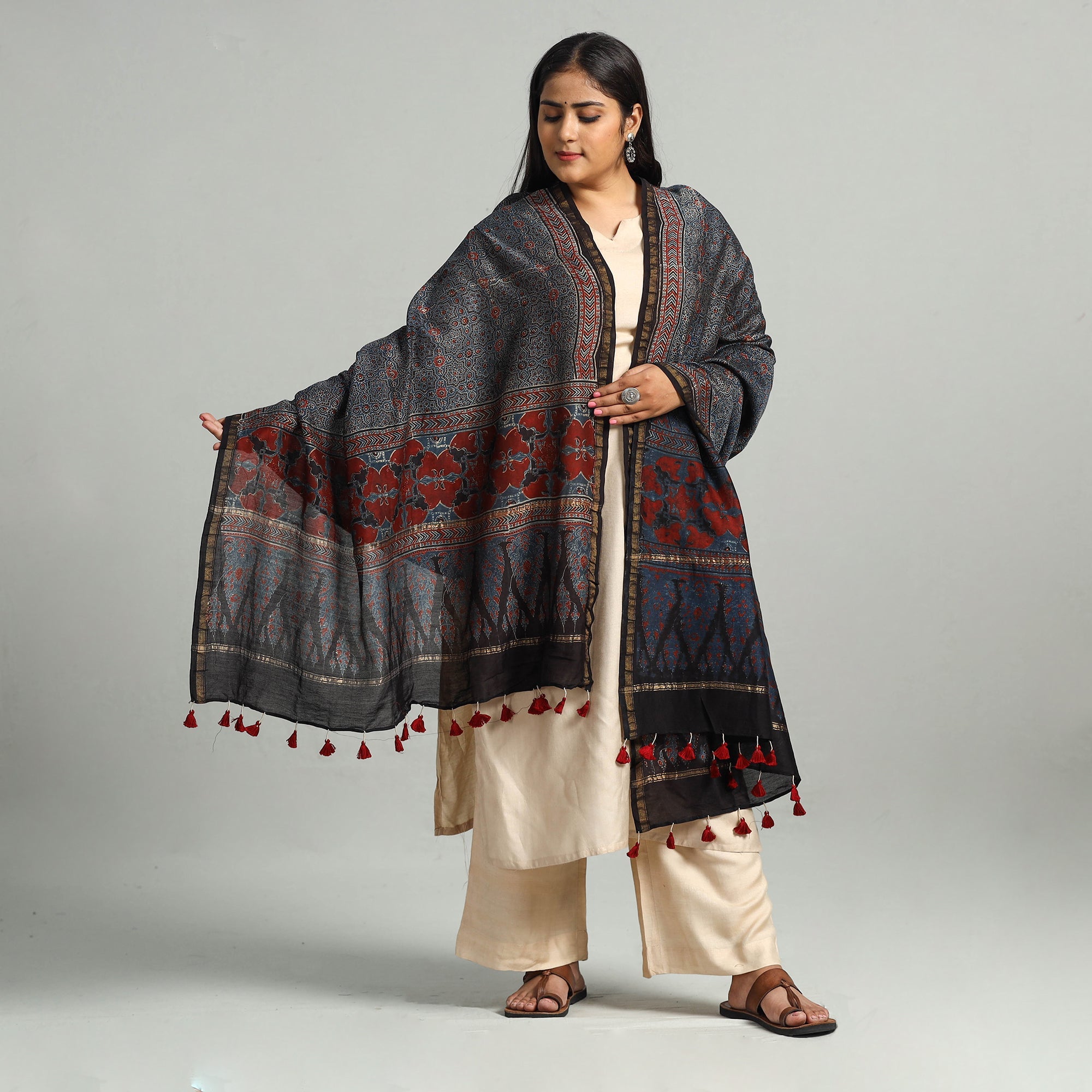 Elevate your style with this fine quality blue ajrakh hand block printed chanderi silk-cotton handloom dupatta with tassels. This exquisite dupatta is made using natural dyes through the traditional techniques of hand block printing by the master artisan of Sufiyan Ismail Khatri, from the Kutch region of Gujarat. This exquisite dupatta can elevate any outfit. It's versatile and suitable for both formal and casual occasions, adding a touch of traditional Indian artistry to your style.