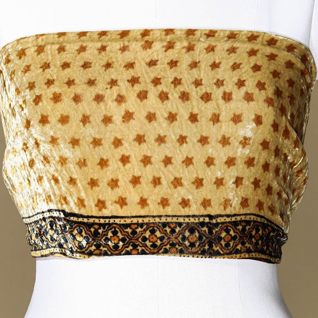 Elevate your wardrobe with our ajrakh hand block printed blouse piece crafted from of high-quality velvet. This exquisite blouse is made using natural dyes through the traditional techniques of hand block printing by the master artisan of Sufiyan Ismail Khatri, from the Kutch region of Gujarat. Perfect for special occasions, this timeless piece promises to enhance your elegance and showcase the rich heritage of Sufiyan hand block printing.